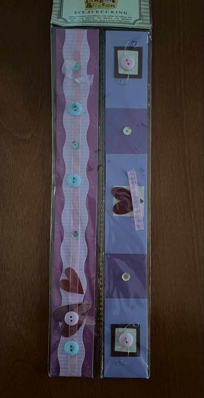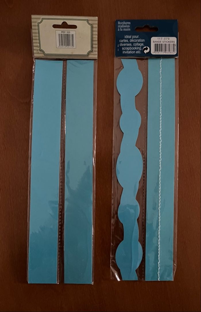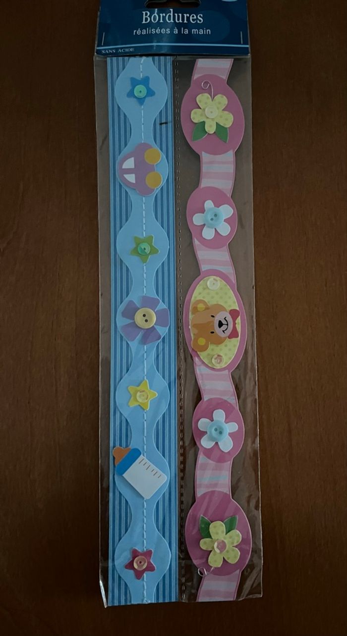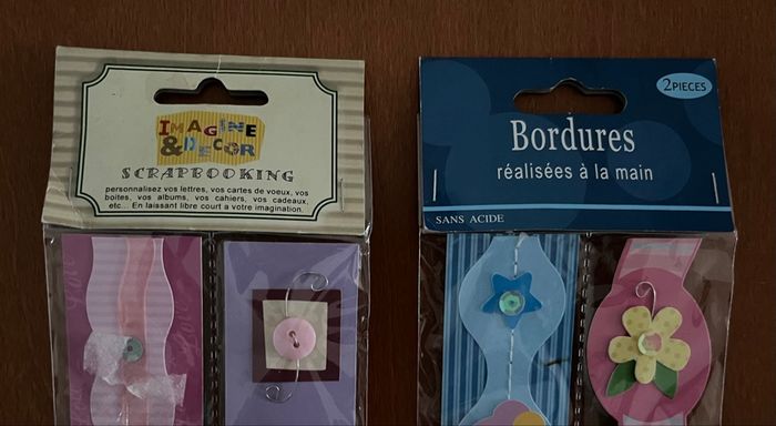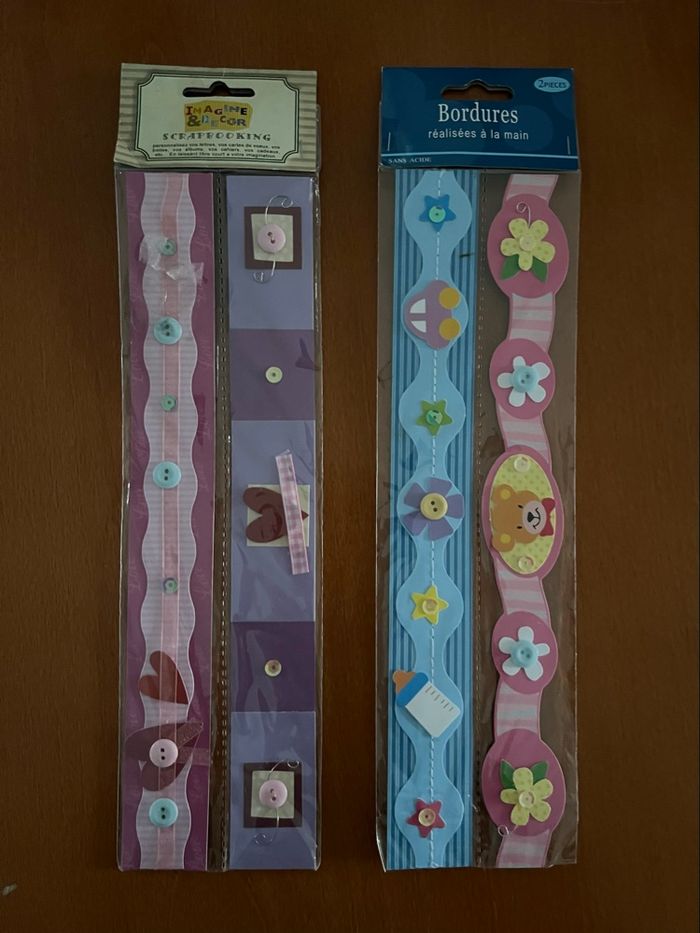 Bonjour, A vendre 2 lots de 2 bordures pour Scrapbooking neuf dans leur emballage, un peu plus de 28 cm en longueur : 2€ Je vends d’autres articles de scrapbooking, n’hésitez pas à regarder mes annonces. Et des vêtements garçon du 3 mois à 10 ans. Des vêtements fille de la naissance à 3 ans .