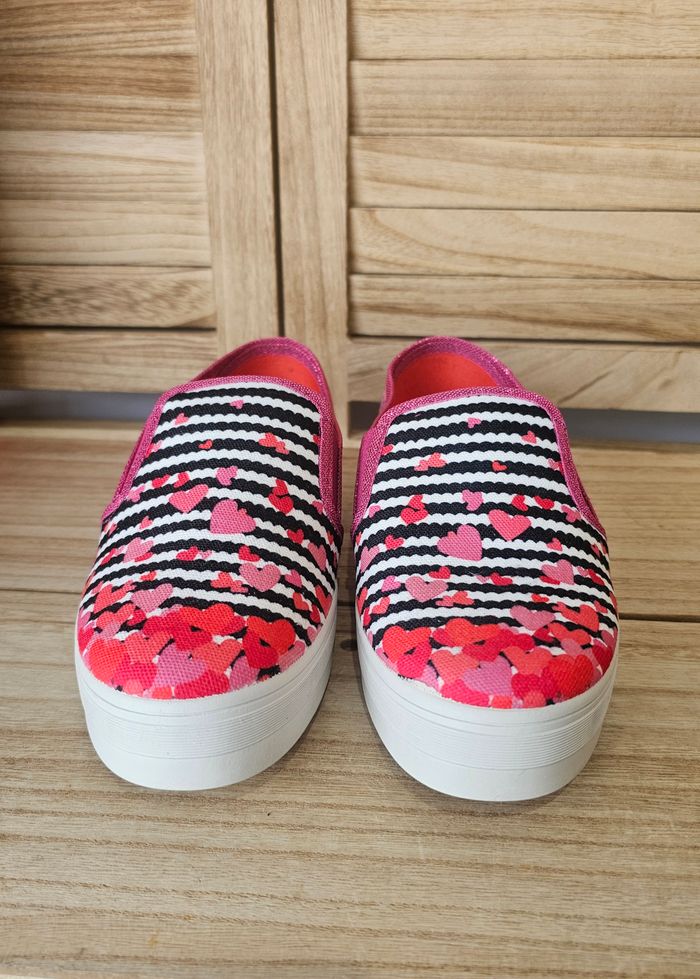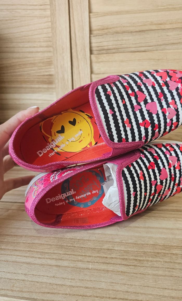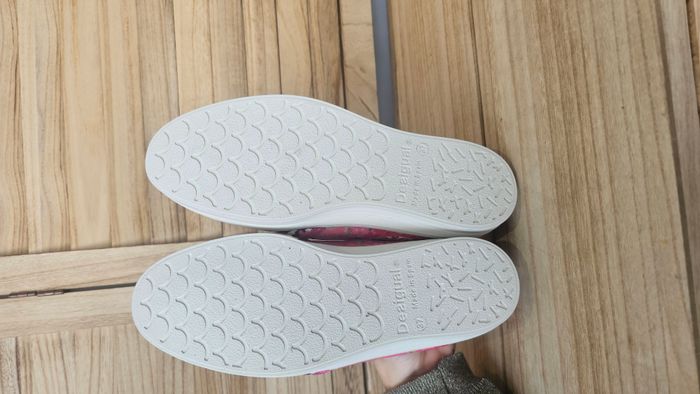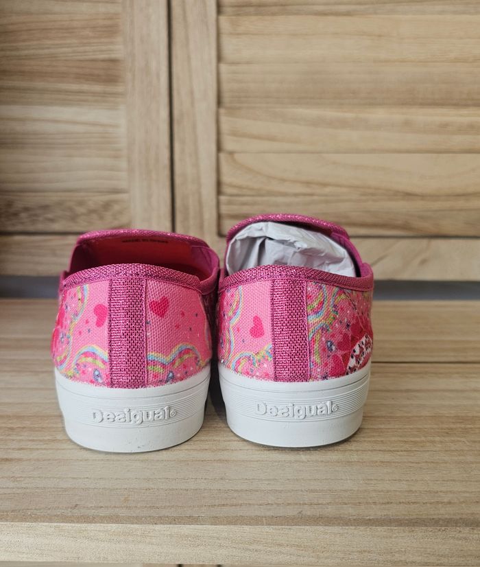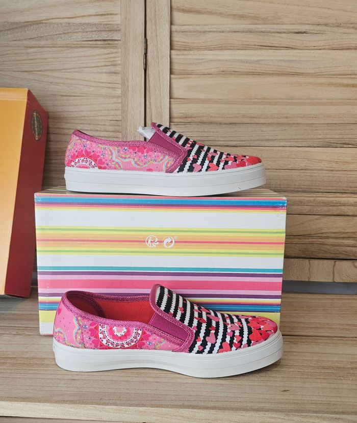 Chaussure Slip On Jamais porté car trop grand, c'est un 37 qui taille plutôt un 37.5cm. #basket #basketslipon #chaussure #chaussuredesigual #desigual #slipon #rose #coeur #basketsanslacet #chaussuresanslacet #neufavecetiquette