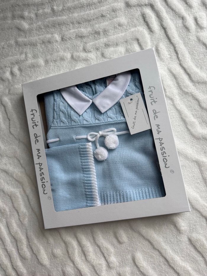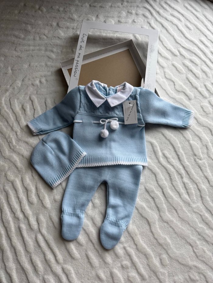 Coffret naissance layette bébé garçon Coloris: bleu Contient 3 pièces : Pull + Pantalon + bonnet Taille unique ( 0/3 mois ) Très bonne idée, cadeau, noel naissance anniversaire baptême