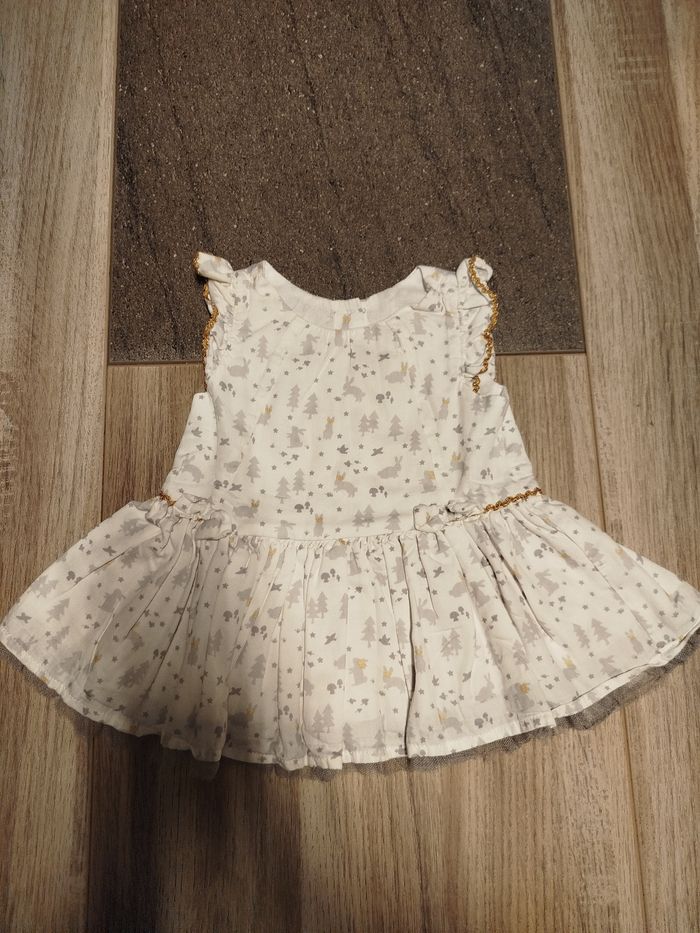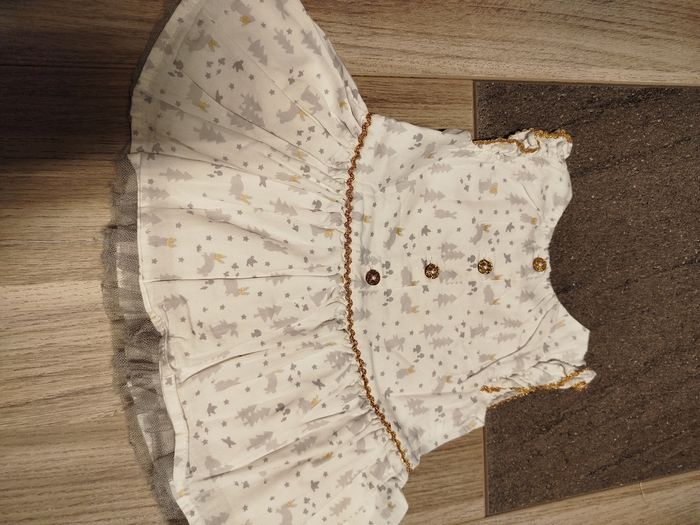 Adorable robe Orchestra thème hiver, idéale pour les fêtes de fin d'année. Blanche avec motifs argentés et dorés. Taille 1 mois, très bon état.