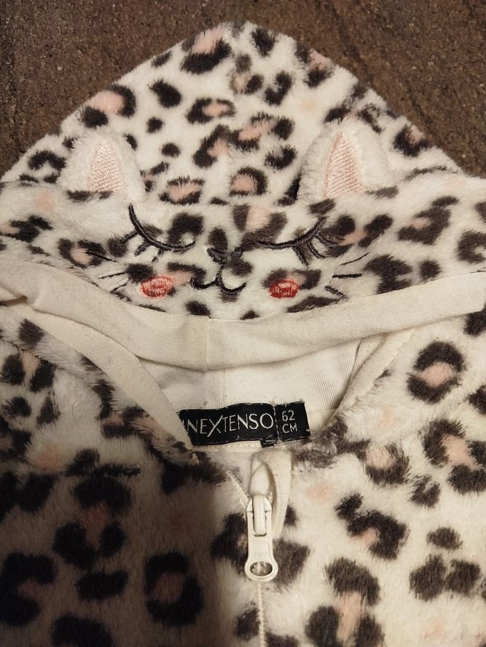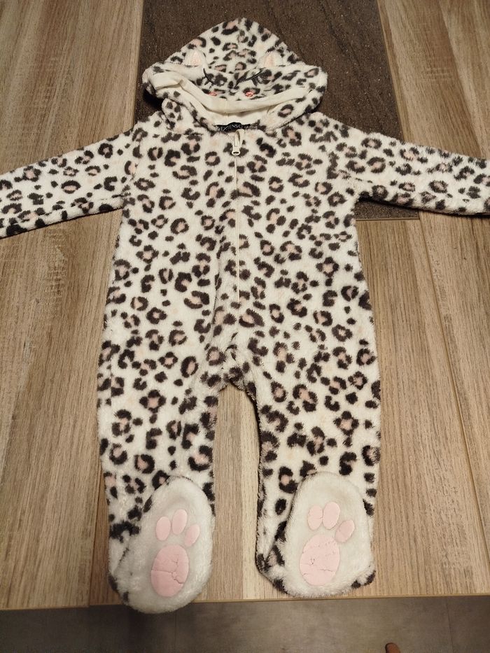 Combinaison polaire motif léopard blanche et rose. Très bon état excepté les pattes qui ont un peu craquelées suite aux lavages.