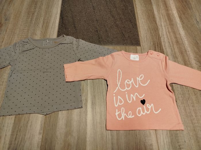 Lot de 2 tee-shirt manches longues. Un de marque Kitchoun gris-brun à pois et un rose pâle "love" de marque Kiabi Taille 3 mois, très bon état.