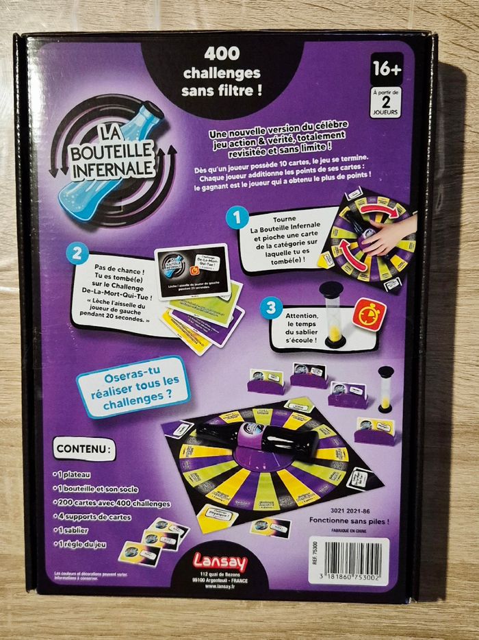 - Contenu : 1 plateau, 1 bouteille et son socle, 200 cartes (soit 400 challenges), 4 supports de cartes, 1 sablier, 1 règle du jeu.