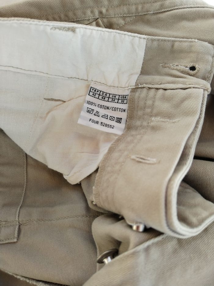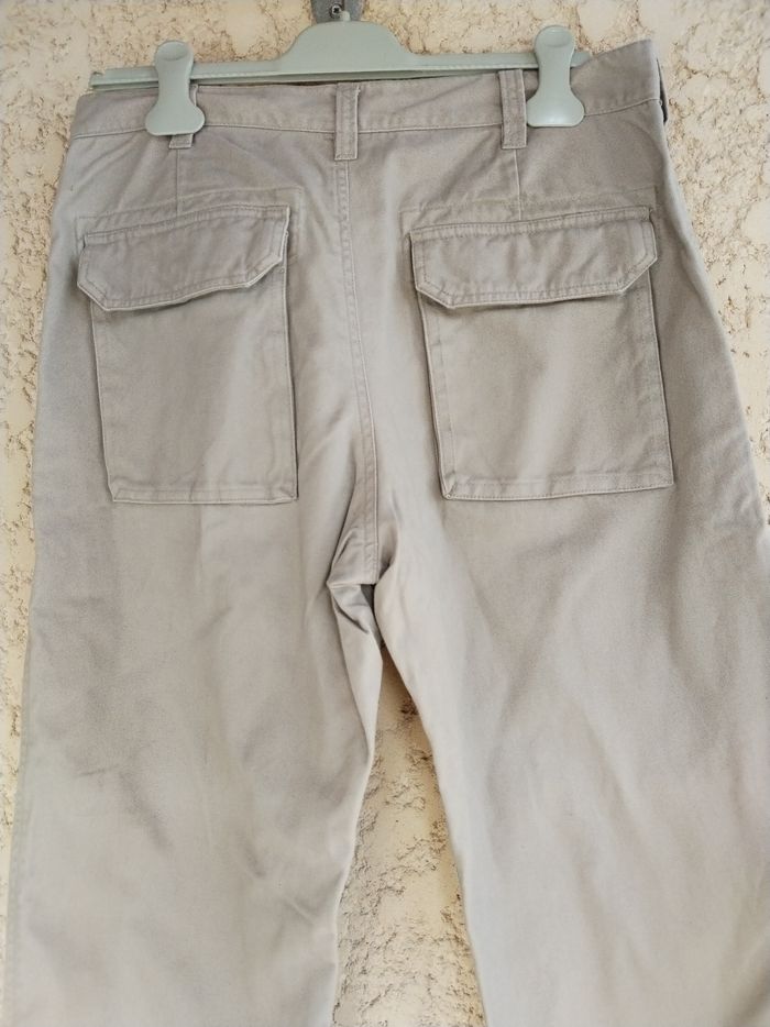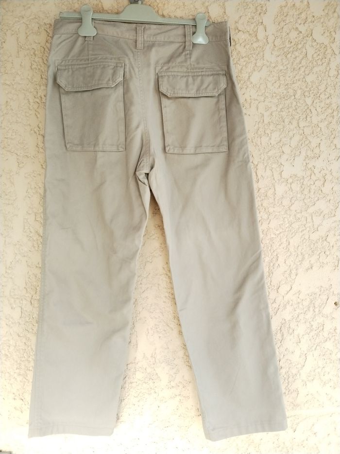 Pantalon homme, taille M, 100 % coton, ceinture à passants classique, fermé par 4 boutons sous patte de boutonnage et 1 bouton à la ceinture, 2 poches latérales devant, 2 poches avec rabat et bouton au dos, couleur beige, tour de ceinture 84 cm, longueur d'entrejambe 76 cm (vous avez la posdibilite de faire des ourlets)