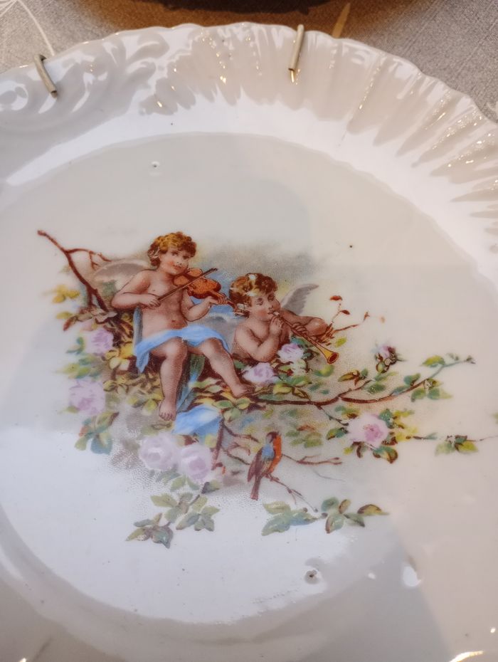 Lot de 2 assiettes décoratives en porcelaine. Fabrication Royal Bavarian P.M.B. Allemagne. Date de fabrication : environ 1879-1895. Motif : angelots peints à la main. Avec supports muraux. Diamètre : 19 cm. Les dessins sont encore en bon état mais il manque un peu couleur dans les cheveux d'un angelot. Le contour doré est aussi effacé par endroit. Bon état général.