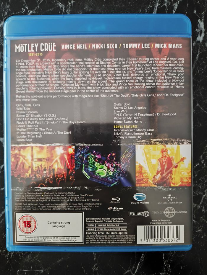 Concert Mötley Crüe : The End - Live in Los Angeles (2016) en très bon état. Plusieurs autres films (DVD et blu-ray) et séries télé disponibles sur mon dressing. Si vous avez des questions ou souhaitez plus de photos, n'hésitez pas à me demander. Prix négociable seulement si vous achetez plusieurs articles. N'hésitez pas à créer un lot et à faire une proposition raisonnable et à me demander un prix. Tag de recherche sur mon dressing : #neboo_video #neboo_bluray #neboo_film blu ray bluray Motley Crue