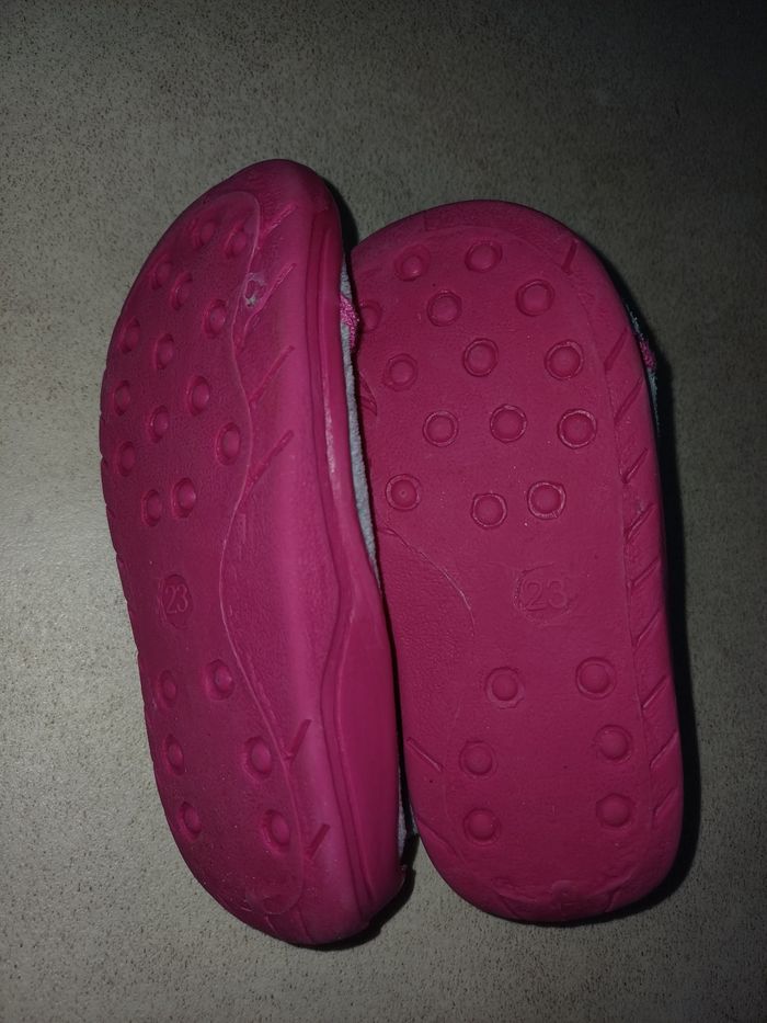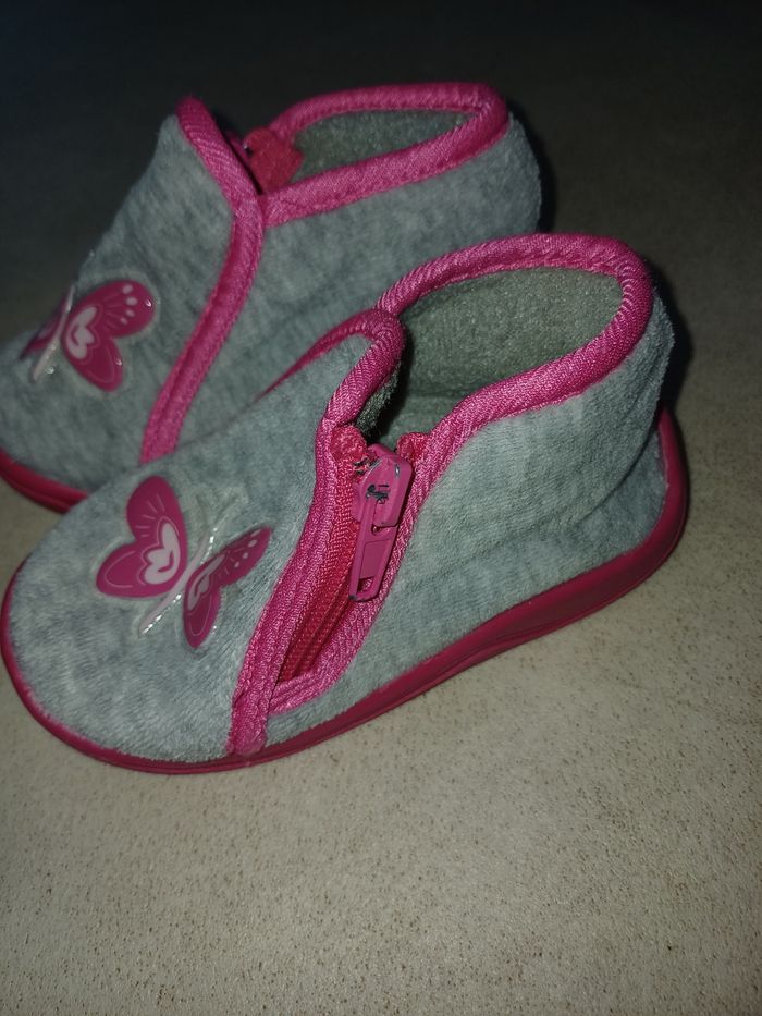 Tres jolie paire de chaussons en tres bon etat. Tres peu portee. De couleur rose et gris.le motif est un papillon.