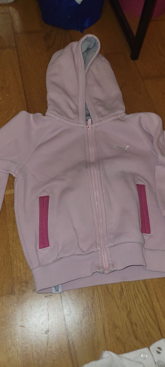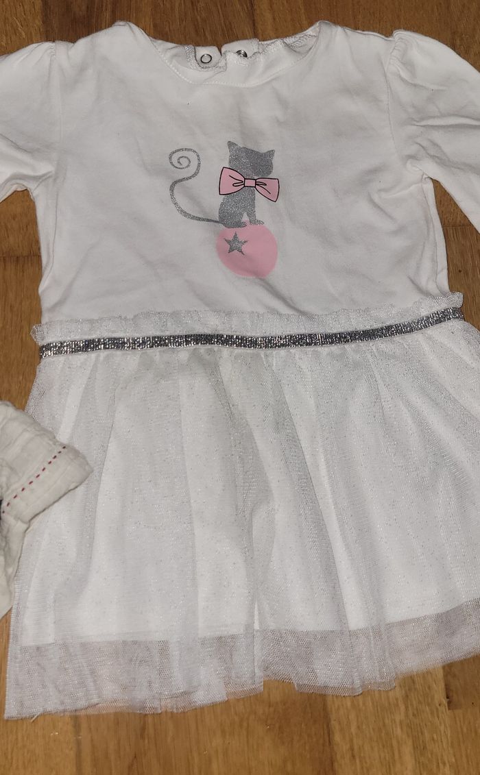 Robe blanche chat : neuve, jamais portée. 12 mois. Veste puma : 12-18 mois Salopette/robe : 12 mois