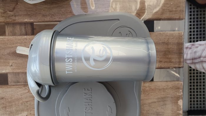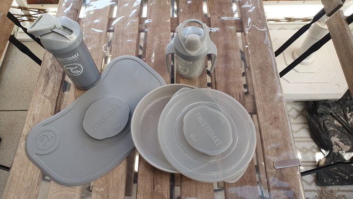 Lot pour repas 1 support assiette 1 assiette 1 couvercle pour assiette 1 verre avec bec 1 gourde L'assiette à des marques de découpe des aliments Et verre à bec marque de dents. Plus de photos sur demande