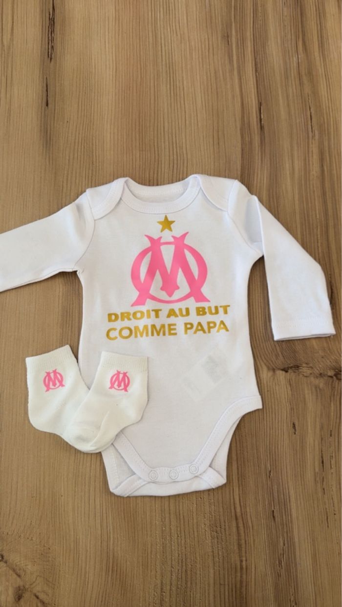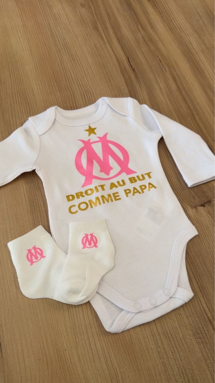 Un petit ensemble plein de douceur et ultra craquant pour habiller bébé avec style ✨ Bodie et chaussette assortie OM “Droit au but comme Papa” — parfait pour un clin d’œil plein d’amour et d’humour 💗 🍼 Body manches longues 🧦 Chaussettes assorties avec le même motif Un duo trop mignon pour une tenue harmonieuse ! 🌟 Idéal pour : • Une première tenue toute douce • Un cadeau de naissance super attendrissant • De jolies photos souvenirs • Faire plaisir à un papa fan de l’OM • Confortable, doux pour la peau de bébé • Motif rose & or tendance • Look adorable assuré😉🩷 💨 Envoi rapide et soigné. #cadeaudenaissance #om #marseille #foot #cadeaupapa