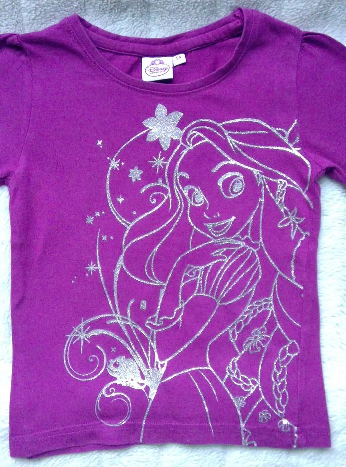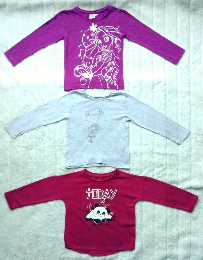 Lot de 3 Tee Shirts manches longues en 5 ans - 1 Tee Shirt violet de la marque Disney (dessin de princesse argenté sur le devant) - 1 Tee Shirt gris de la marque KIABI - 1 Tee shirt rouge de la marque TISSAIA Envoi ou remise en mains propres Paris 13 ou 5