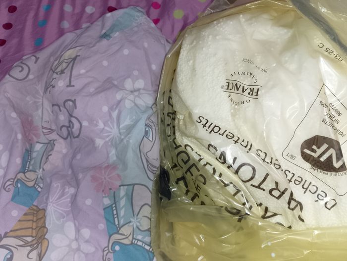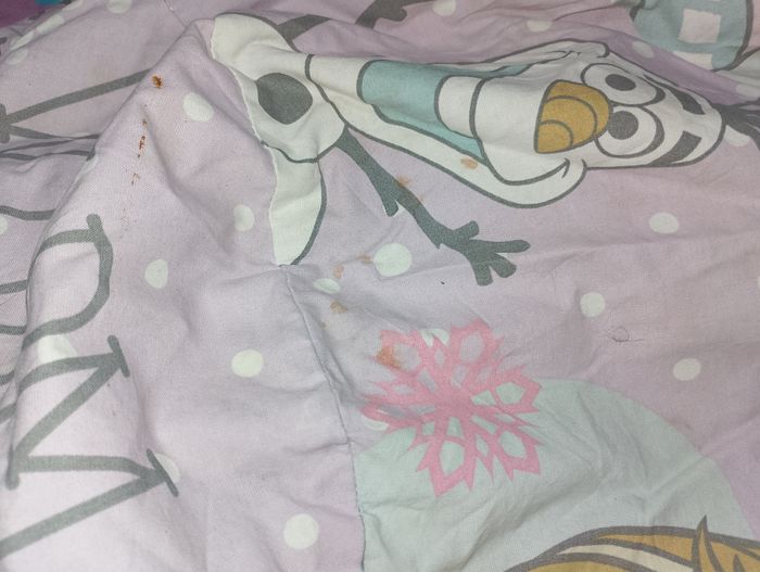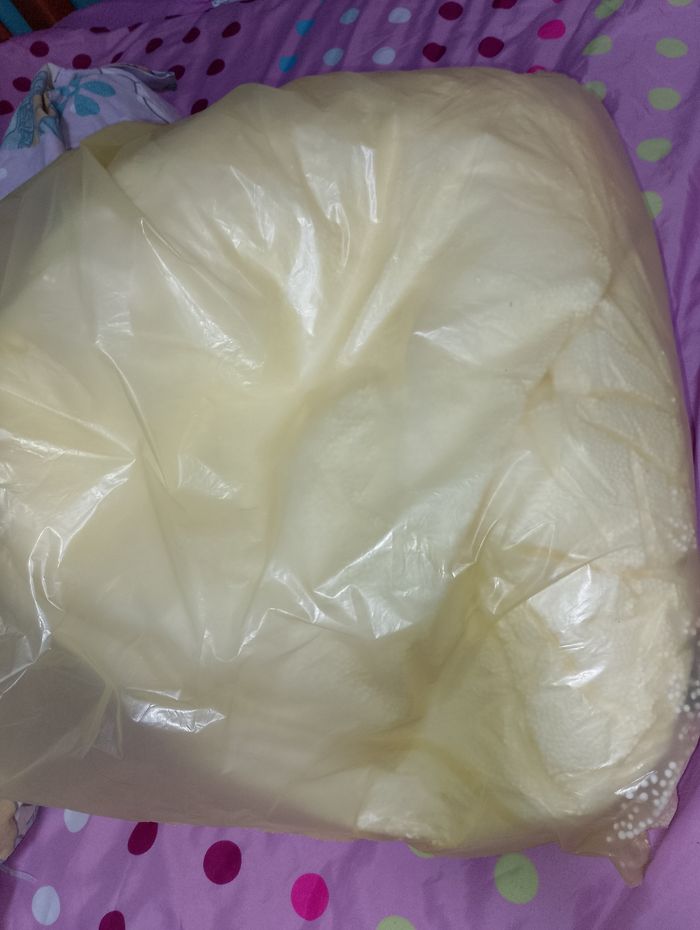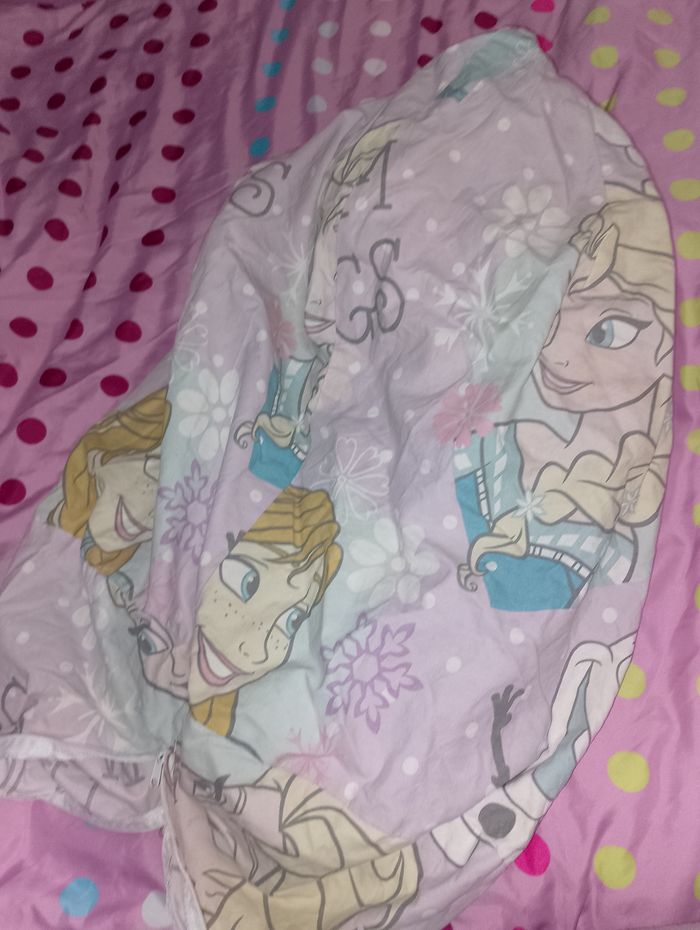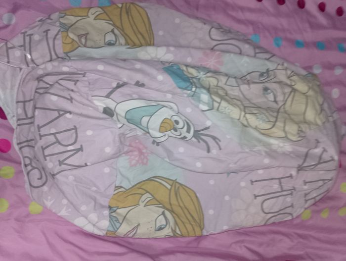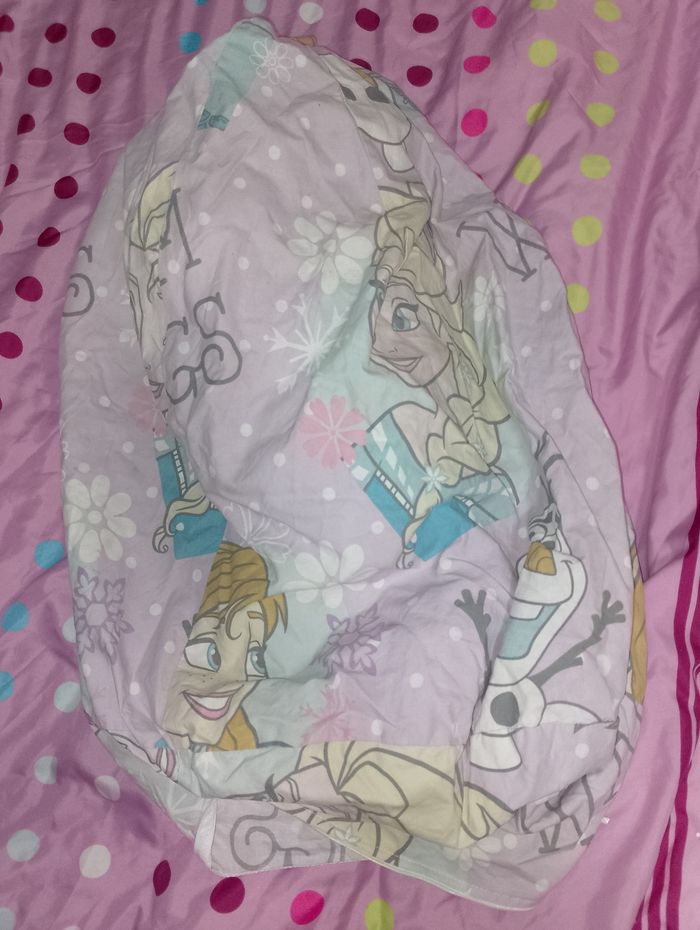 Pouf reine des neiges La housse a besoin d'un lavage, toutes les billes sont dans un plastique Il faudra recoudre le système qui garde les billes une fois la housse lavé Vendu dans l'état