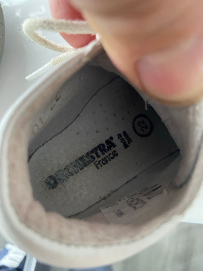 Adorables chaussures premiers pas de la marque Orchestra, idéales pour accompagner les premiers pas d’un bébé. Confortables, mignonnes et bien maintenues grâce à leur coupe montante à lacets. 👟 Détails Marque : Orchestra Taille : 22 Couleur : Blanc (cuir lisse) & gris (semelle + détails) Style : Montantes, lacets → bon maintien de la cheville Motifs : • Cœurs appliqués sur l’avant (dont un avec petit nœud) • Semelle extérieure grise souple avec motifs floraux/feuillages gravés Fabrication : Made in Tunisia 🌟 État Occasion Légères traces d’usage normales (quelques marques sur le cuir blanc, lacets légèrement jaunis) Semelles extérieures en bon état Intérieur propre