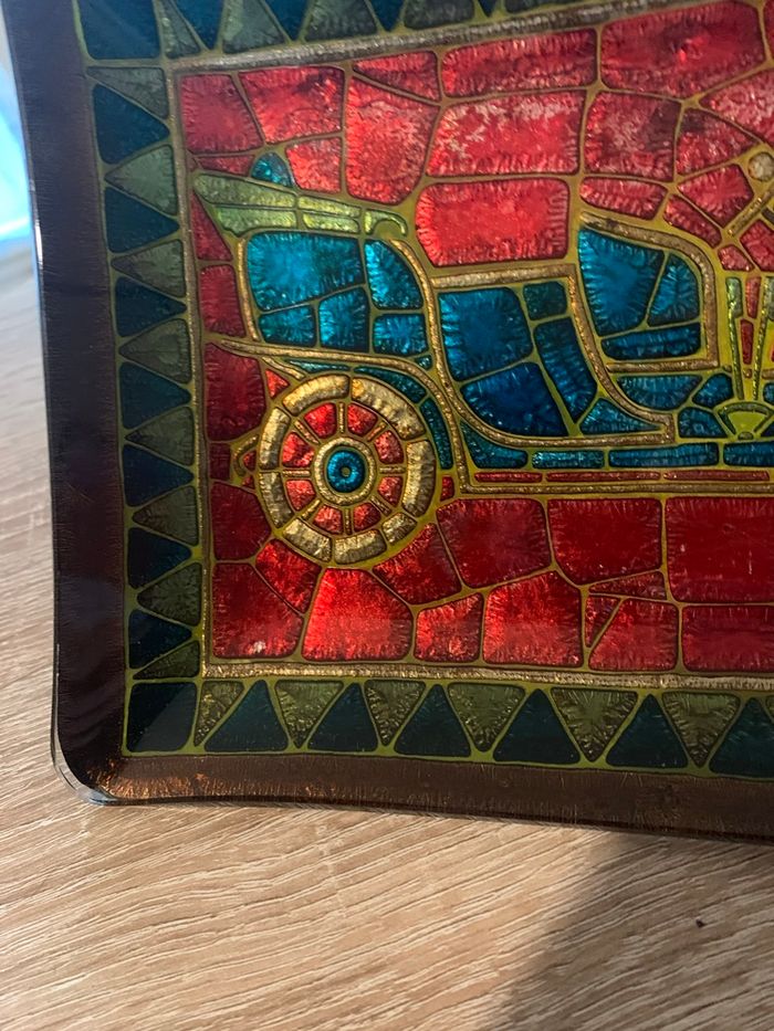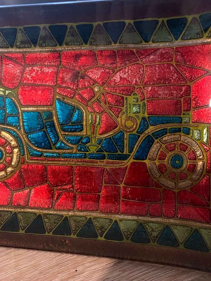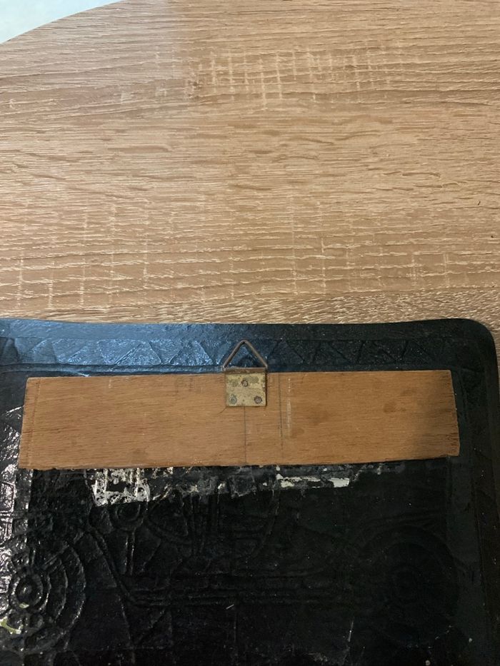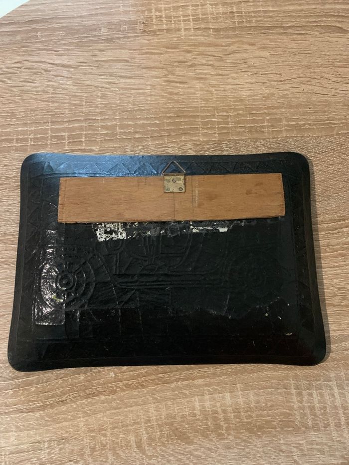 Mesure 23,5 cm x 17 cm En émail il me semble… ? Couleur un peu passé à certains endroits ( voir photo) Un bout de bois a été collé à l’arrière pour pouvoir l’accrocher au mur . Le dos est abimé ( voir photo) Envoi rapide et soigné sous protection