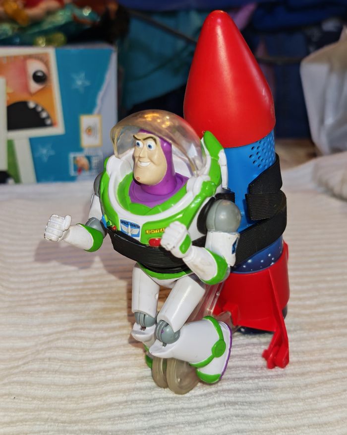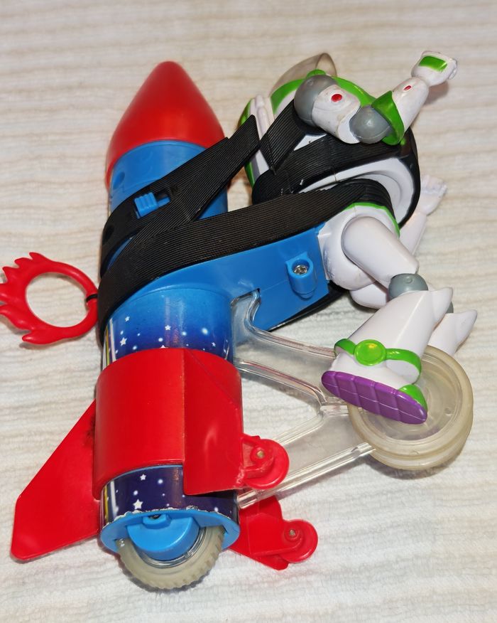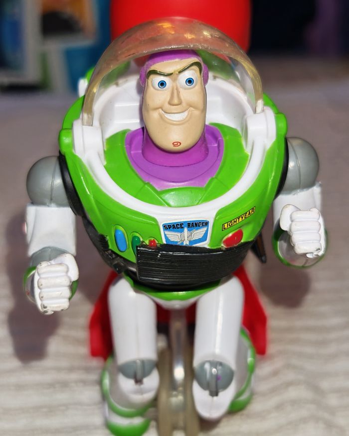 Buzz l'éclair, en très bon état. Il est doté d un remontoir à ficelle. Quand on tire l' anneau rouge et qu'on lâche, il avance en pédalant, en bougeant la tête et en émettant des sons. #jouetsbertram