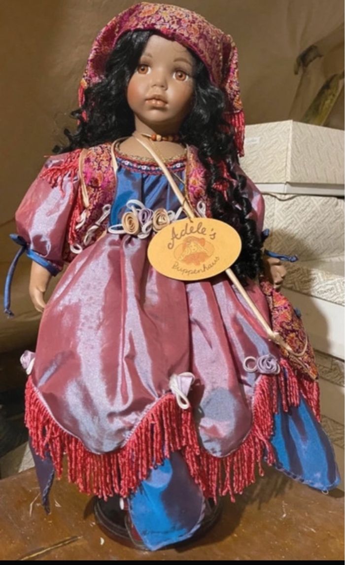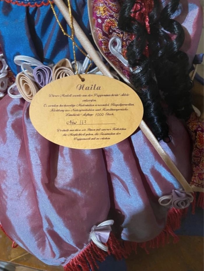 A vendre. Naila est une rare poupée d'art en porcelaine faite à la main de la marque allemande Adele's Puppenhaus. Elle est vendue avec son support. Elle fait partie d'une édition limitée de 1000 pièces. Elle porte le numéro 163. Taille: 51 cm (debout). Naila est en excellent état et peut être offerte.