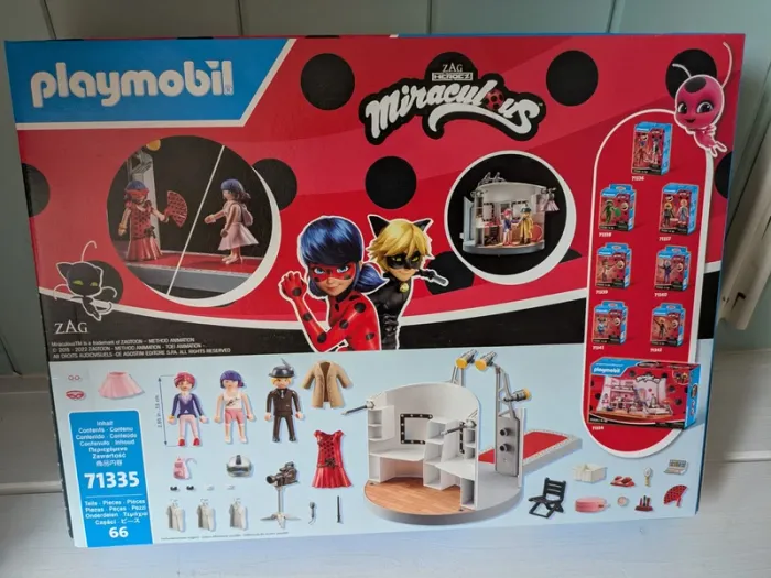 Produit neuf 71335 playmobil miraculous envoi rapide et soigné Ce set comprend le personnage principal, Marinette Dupain-Cheng, une jeune styliste pleine d'ambition, ainsi qu'Adrien Agreste, son camarade de classe et mannequin pour le défilé de mode. La piste de défilé est composée d'une passerelle amovible et d'une loge avec deux postes d'habillage ainsi que des éléments muraux. Ici, les personnages peuvent se préparer pour leurs performances et ranger leurs outils de maquillage et leurs accessoires sur les étagères du mur de la loge. Marinette peut choisir entre une élégante robe avec un masque et des éventails assortis, une jupe, un sac à dos, ainsi que différents colliers et bracelets. Adrien est équipé d'un manteau en silicone, d'un casque, d'une canne et d'un élégant chapeau.