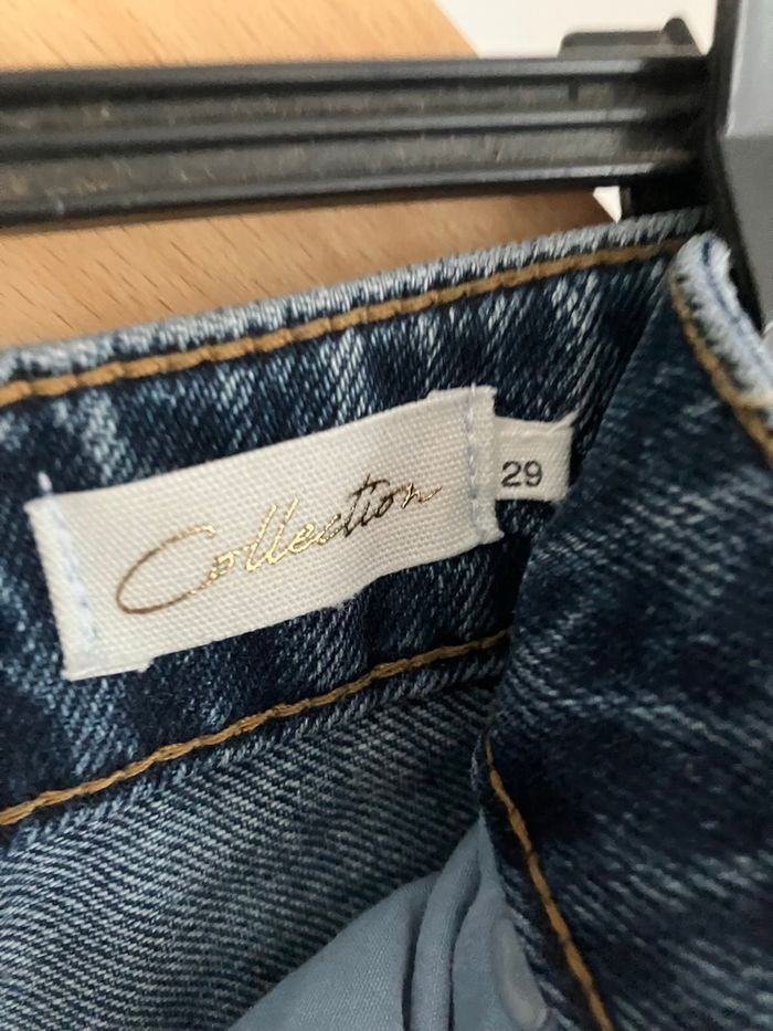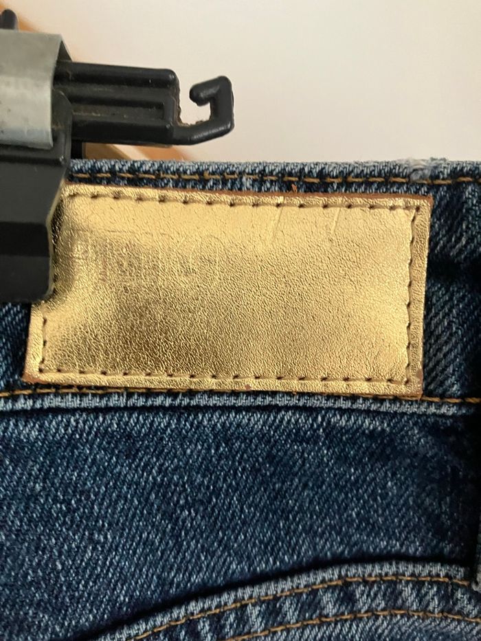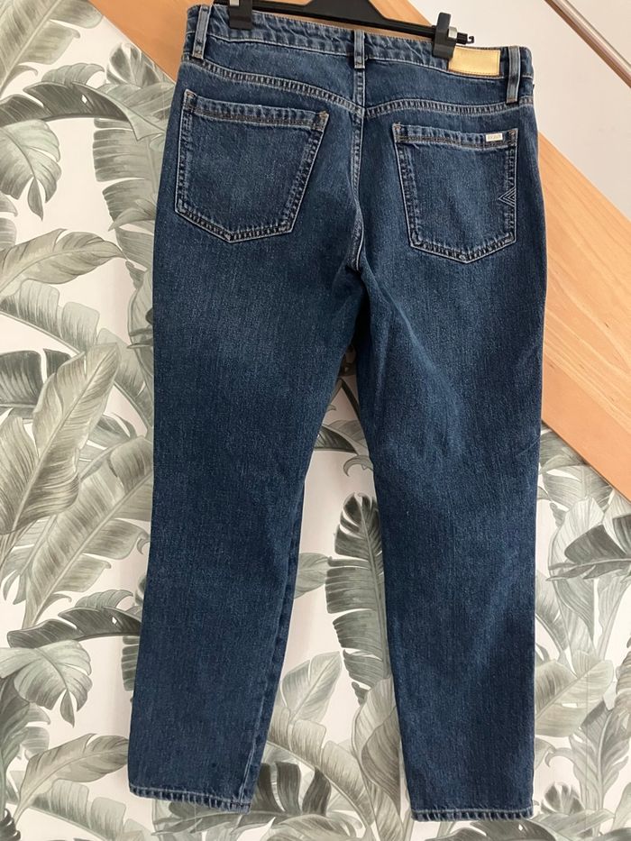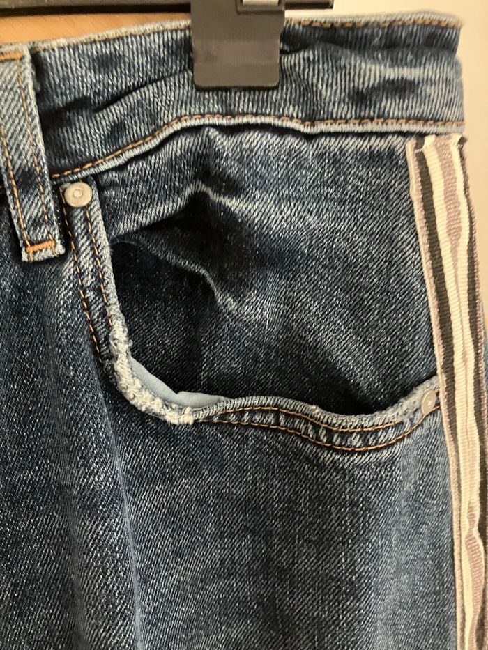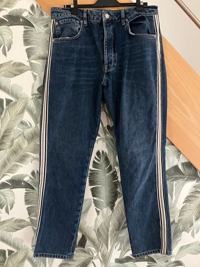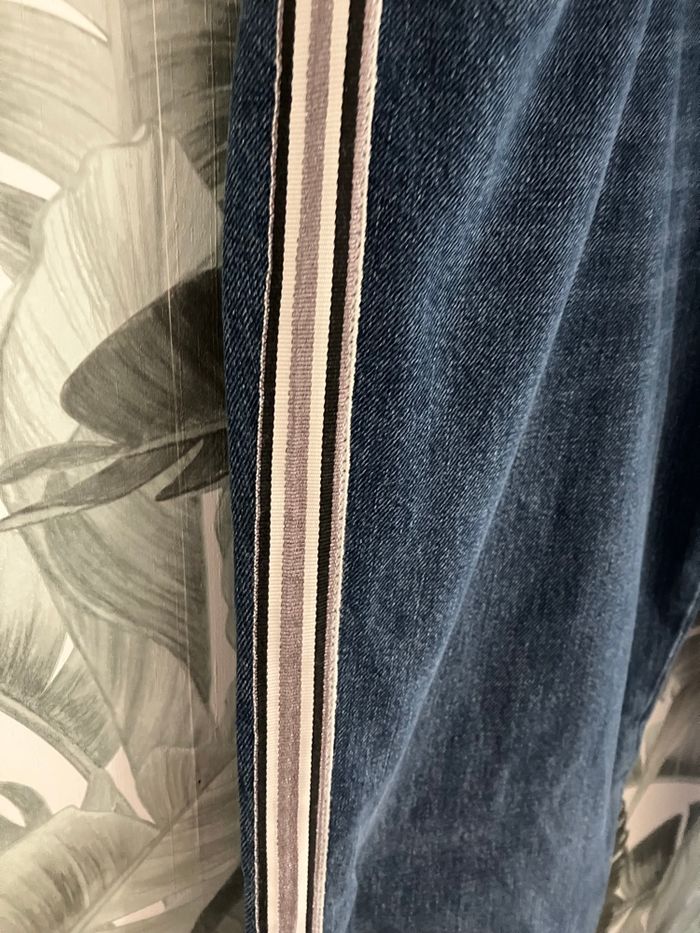 Jean droit en bon état. Taille 39 (cf étiquette : 29) Bandes latérales avec 3 couleurs : noir-blanc et gris argenté 2 poches bordures élimées (voir photos) 2 poches arrière Fermeture avec boutons Composition : 100 % coton Dimensions : - Taille : 39 cm - Hauteur de la taille au bas des jambes : 93 cm - Longueur depuis l’entrejambe jusqu’au bas : 70 cm - Largeur de la jambe à l’entrejambe : 27 cm - Largeur de la jambe en bas : 15 cm