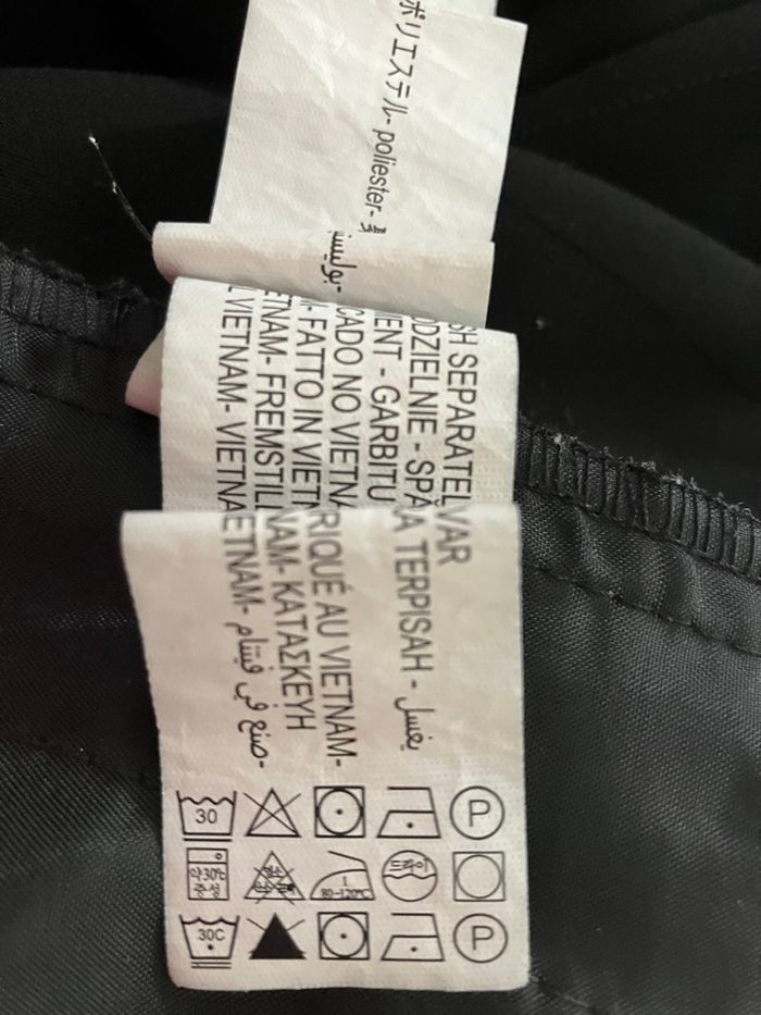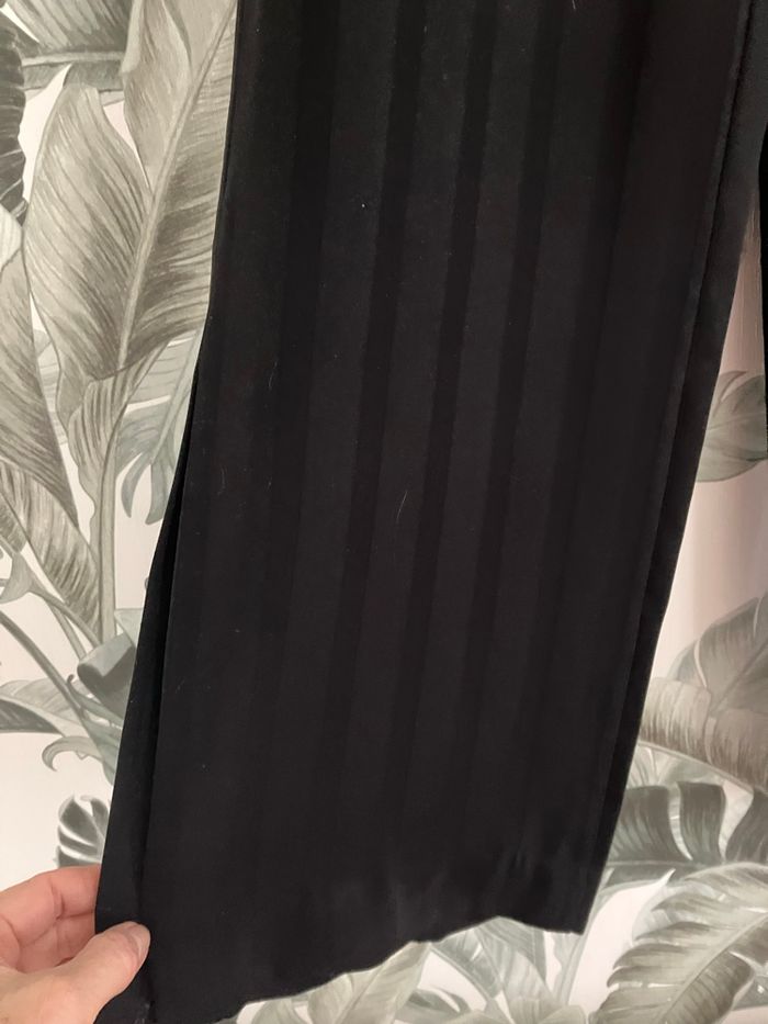 Pantalon large en très bon état. Effet rayures visibles le tissu (voir photos) Taille XS Jambes larges avec une fente d’une hauteur de 30 cm sur le côté en bas 2 poches latérales Fermeture éclair Composition : 100 % polyester, Dimensions : - Taille : 36 cm - Hauteur de la taille au bas des jambes : 109 cm - Longueur depuis l’entrejambe jusqu’au bas : 82 cm - Largeur de la jambe à l’entrejambe : 30 cm - Largeur de la jambe en bas : 28 cm