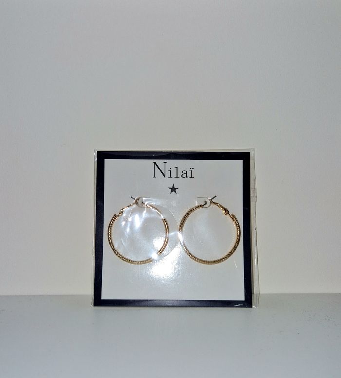 Boucles d'oreilles créoles dorées nilaï neuves et emballées, diamètre de 4 cm.