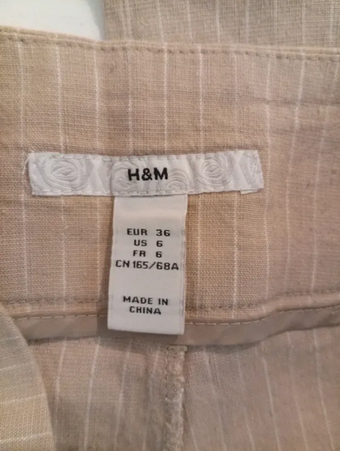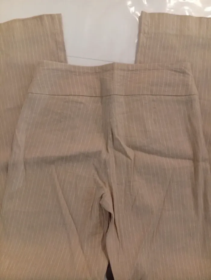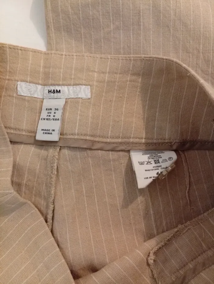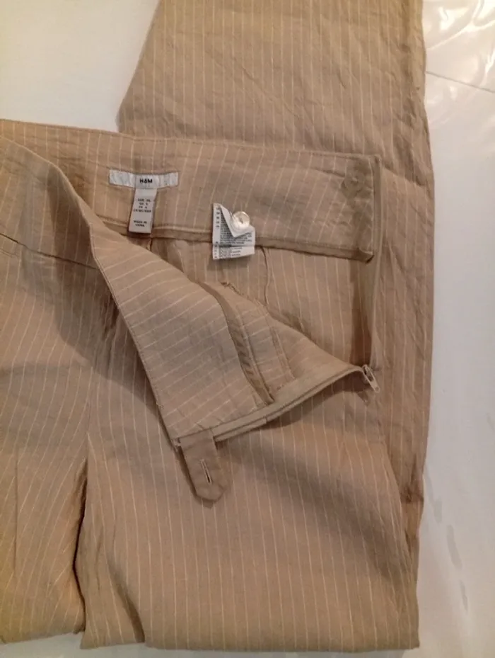Pantalon pince beige à rayure blanche, taille 36 de la marque H&M, fermeture éclaire sur le coté . 58% LIN 40% VISCOSE 2% ELASTHAN