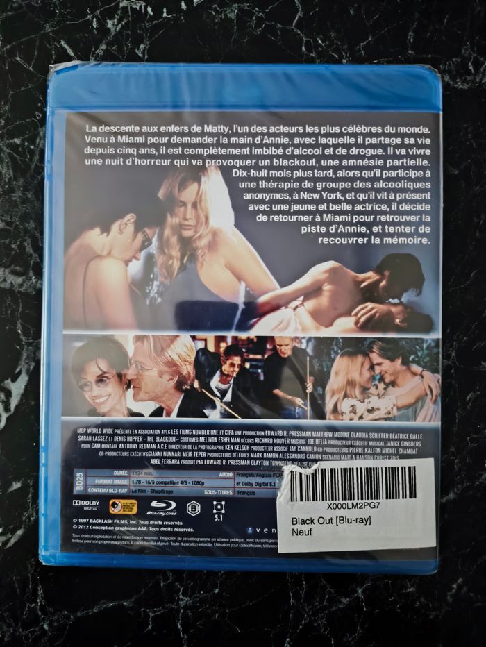 Film The Blackout (1997) neuf encore sous blister. Thriller et Drame d’Abel Ferrara avec Matthew Modine, Claudia Schiffer, Dennis Hopper, Béatrice Dalle et Sarah Lassez. Plusieurs autres films (DVD et blu-ray) et séries télé disponibles sur mon dressing. Si vous avez des questions ou souhaitez plus de photos, n'hésitez pas à me demander. Prix négociable seulement si vous achetez plusieurs articles. N'hésitez pas à créer un lot et à faire une proposition raisonnable et à me demander un prix. Tag de recherche : #neboo_video #neboo_bluray #neboo_film blu ray bluray langue français française French FR