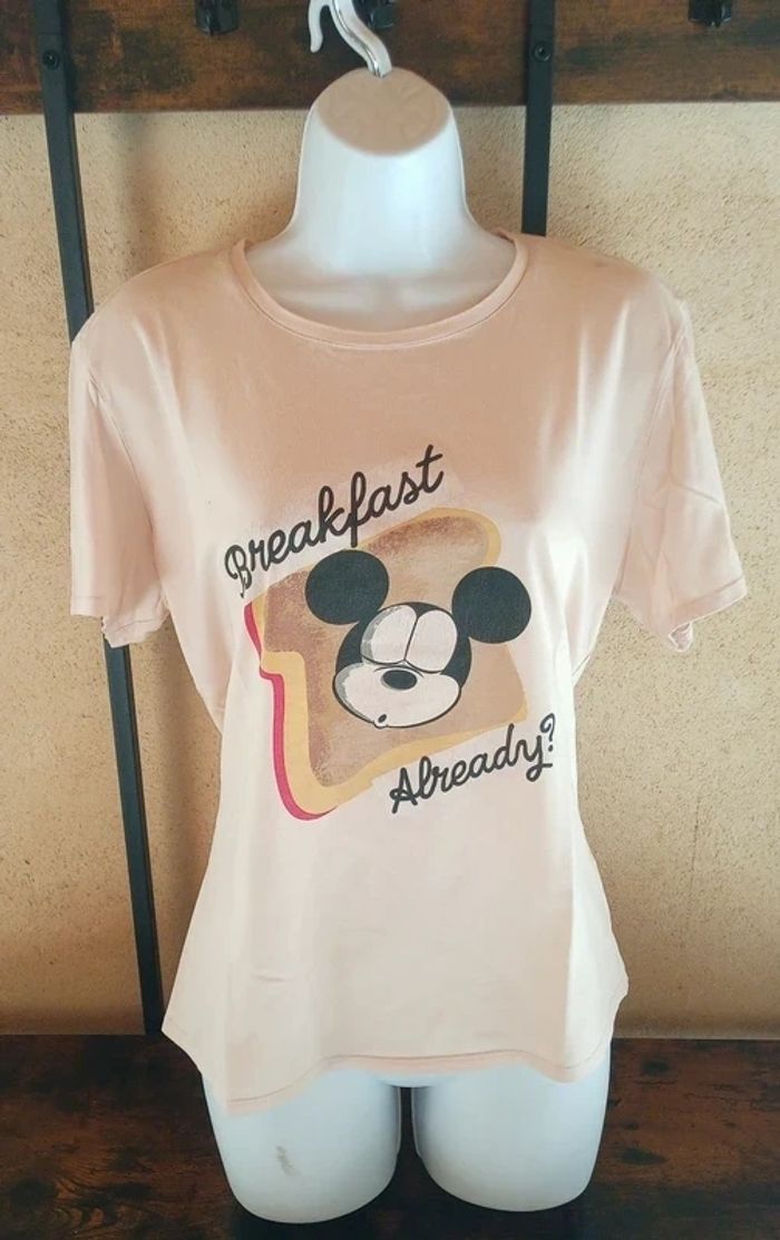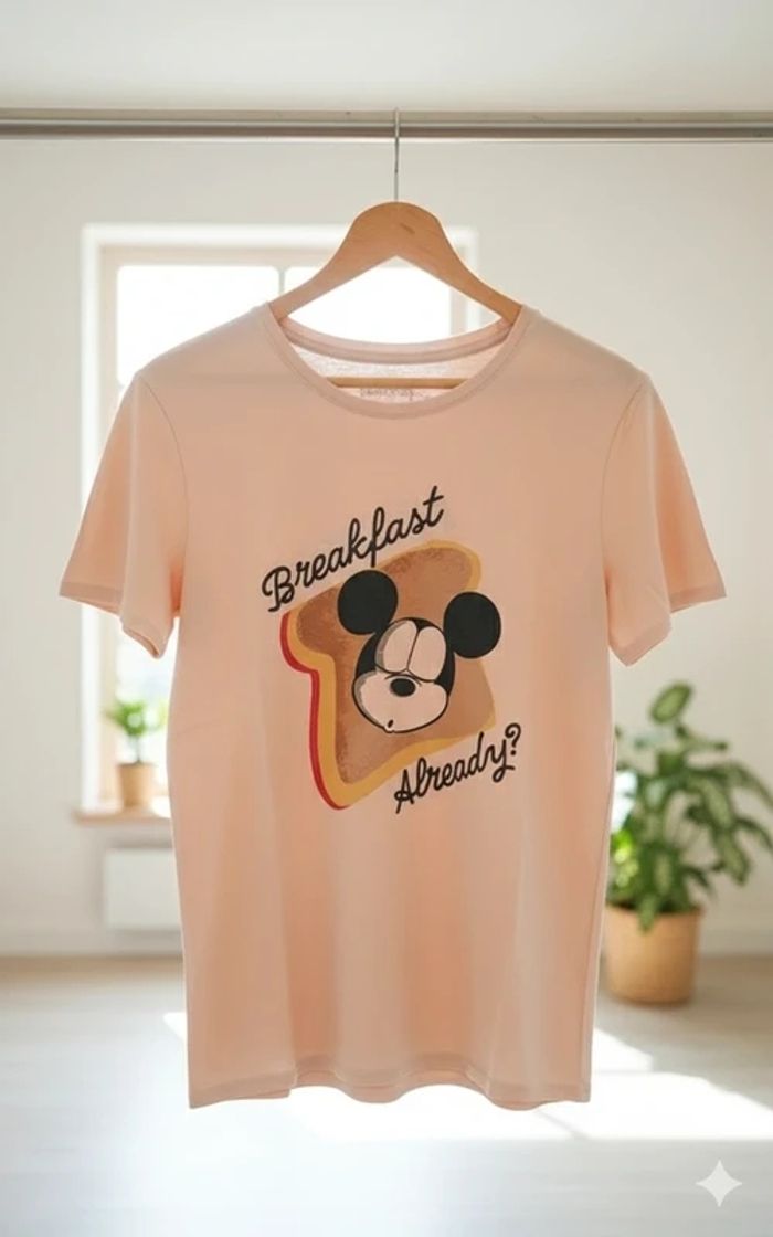 T-shirt Disney Taille : L Prix : 4€ Très bon état couleur nude/rose pâle ! Il arbore un adorable motif de Mickey sur une tranche de pain grillé avec l'inscription humoristique "Breakfast Already?". Parfait pour les fans de Disney Disponible immédiatement Envoie rapide et soigné 🩷Remise activé de -30% dès 3 articles achetés 🩷