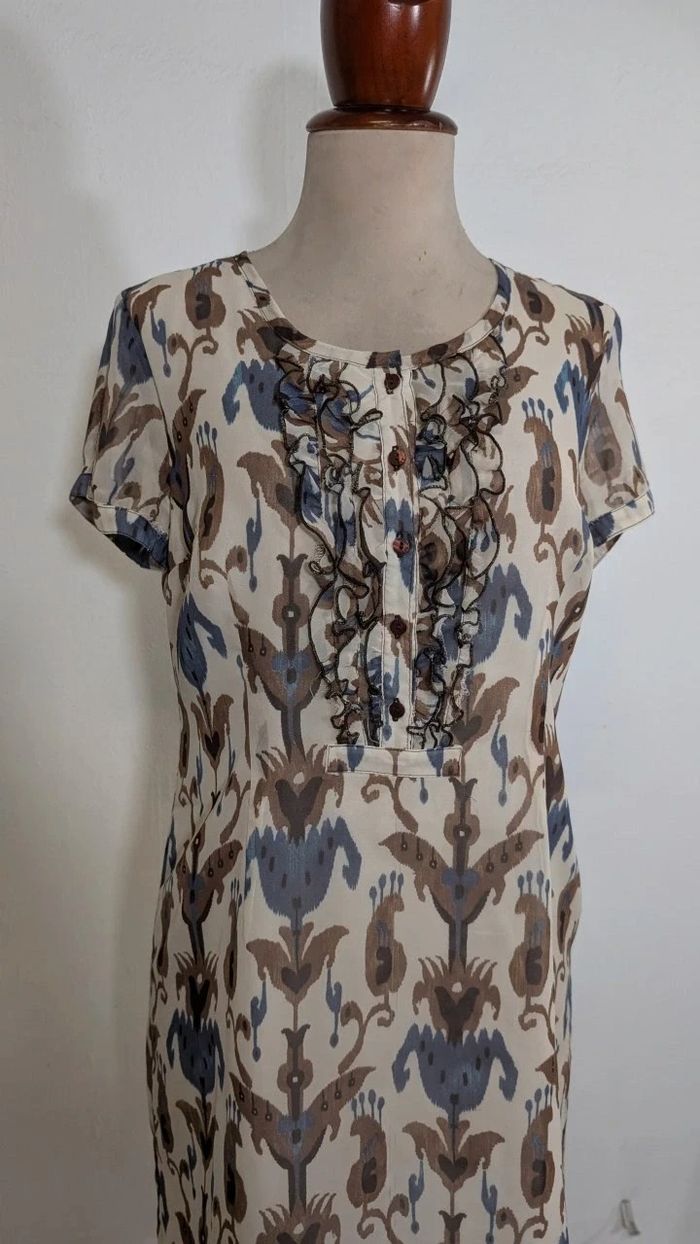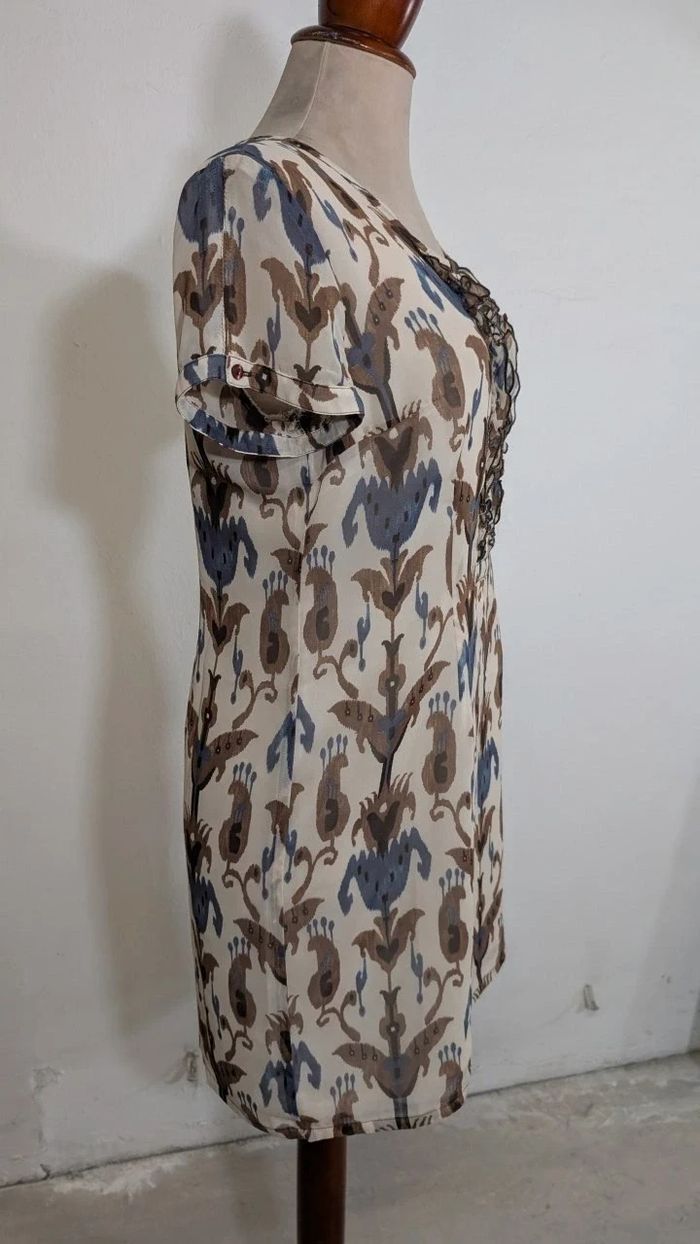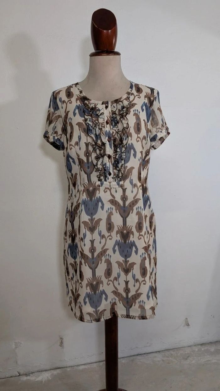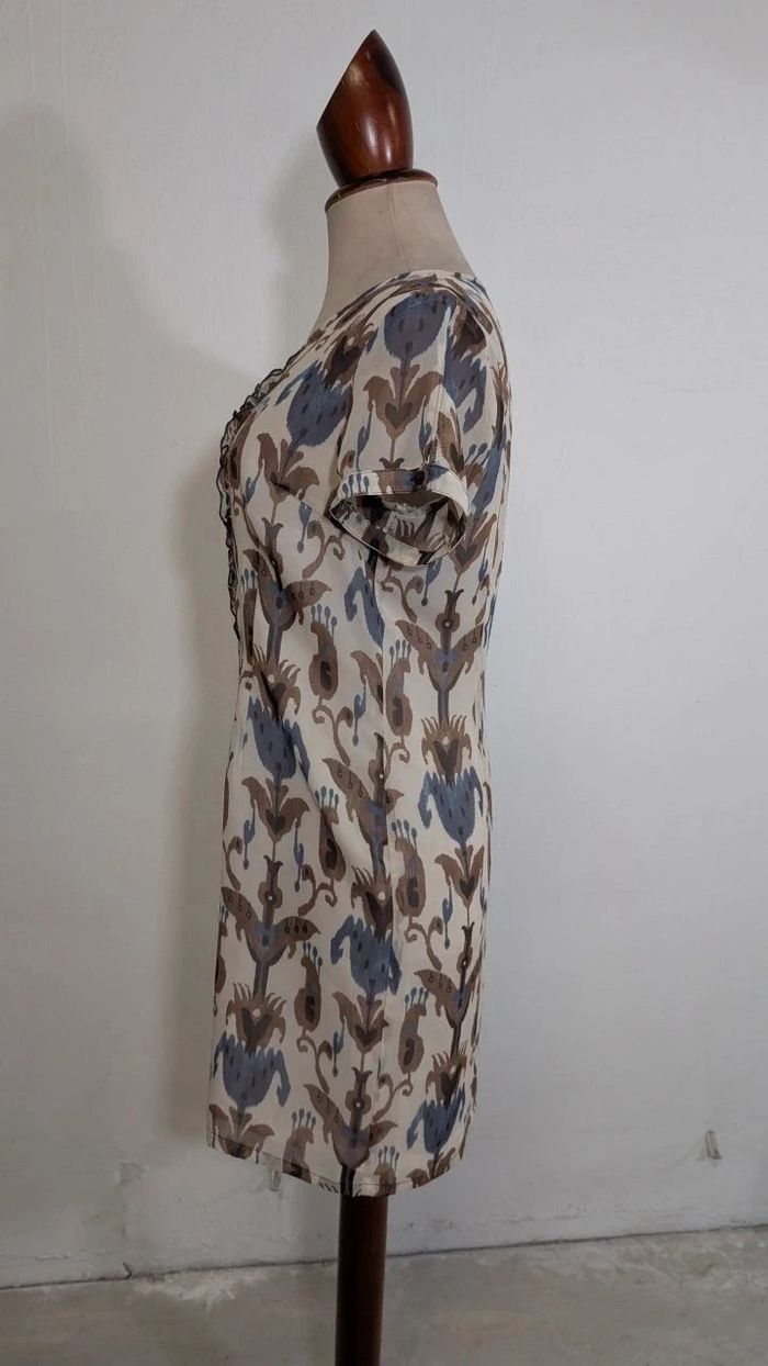 Vestido corto Gemfields New Look, gasa estampada con volantes y botones frontales Vestido corto Gemfields New Look, con manga corta, volantes decorativos en el pecho y botonadura hasta el ombligo. Diseño fluido de gasa ligera con doble capa (forro interior), sin cinturón. Estampado de inspiración étnica en tonos beige, marrón y azul grisáceo, ideal para el día a día o looks boho de verano. ✅ Artículo de segunda mano en muy buen estado. Sin manchas ni desperfectos visibles, tejido y color perfectamente conservados. 🔍 Hashtags: #lavintageriebcn_M #lavintageriebcn_vestido #lavintageriebcn_boho #lavintageriebcn_gasa 📏 Talla 42 (equivale a M) Hombros: 39 cm Pecho: 45 cm Largo: 90 cm 🇬🇧 Gemfields New Look short dress with ruffled chest, buttons and light chiffon fabric. Size M, excellent condition. 🇫🇷 Robe courte Gemfields New Look en mousseline légère, volants et boutons. Taille M, très bon état. #lavintageriebcn #vintagespain #vestidoboho #fashionvintage #newlookdress #modaconsciente #vintedspain #dressvintage #bohochic #summeroutfit #modamujer