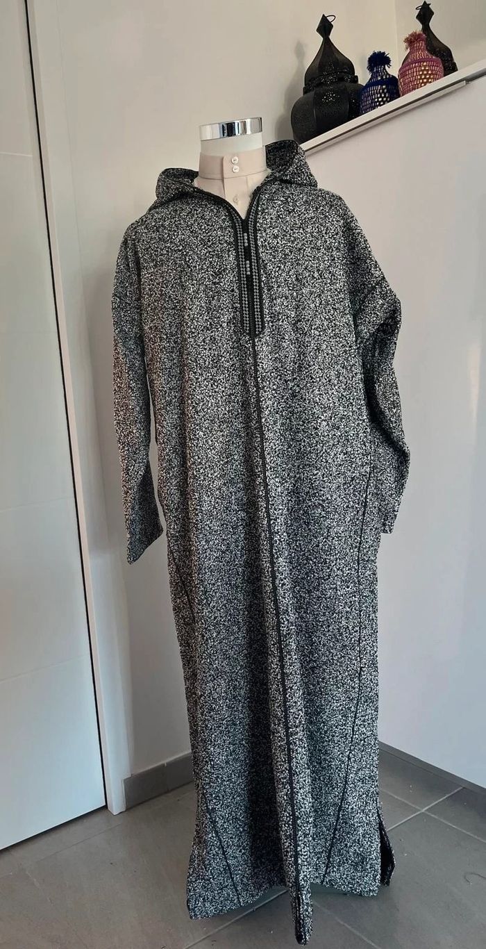 Modèle ADZA Djellaba premium hiver, épaisse, traditionnelle, marocaine avec capuche, manches longues , pas de poche mais une ouverture au niveau des poches, Sahara Très Belle qualité, laine intérieur et extérieur Chiné noir Taille 2XL longueur 143 cm Largeur 72 cm Idéal taille entre 1m85 et 1m90 NEUF Origine Marrakech 🇲🇦 Vendue sans Qamis #Maroc #djellaba #muslim #qamis #marocain #Marrakech #capuche #hiver #berbere #laine