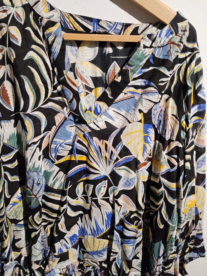 Très belle tunique MS Mode, taille 52, à motifs floraux et feuillages colorés sur fond noir.