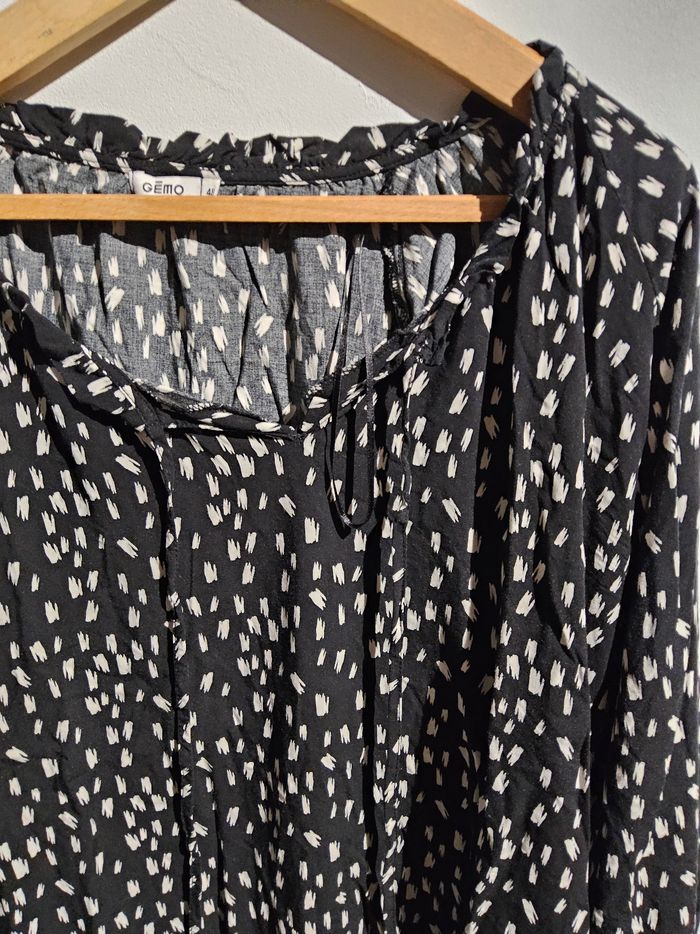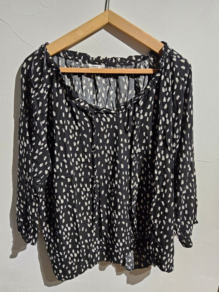 Blouse Gémo – Taille 48 Blouse légère et confortable de la marque Gémo, en taille 48, à motif noir et blanc moderne. Coupe fluide, manches longues, col avec petits liens, idéale pour un look décontracté ou habillé. 🌟 Très bon état 📏 Taille : 48 🎨 Couleur : Noir à motifs blancs