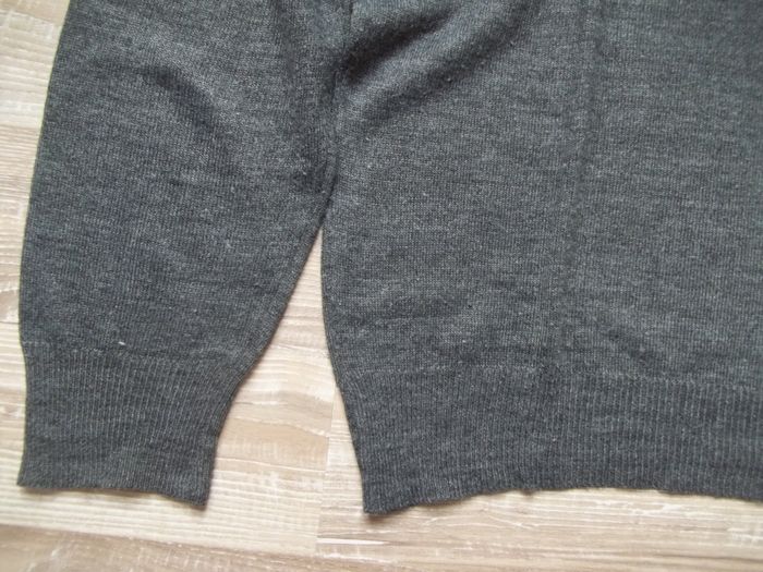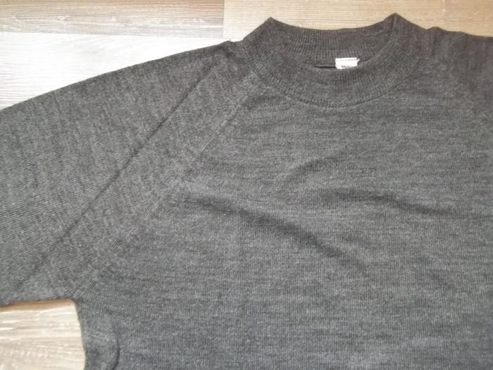 Pull à manches longues et col rond doublé légèrement montant, 100 % acrylique, gris assez foncé, emmanchures américaines. Un peu lustré et bouloché. Longueur 63 cm, manches (depuis col/sous bras) 65/43 cm, largeur aisselles 50 cm. J-M