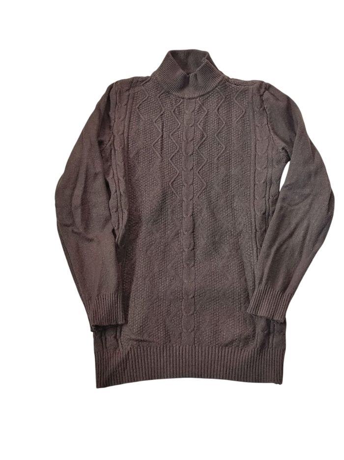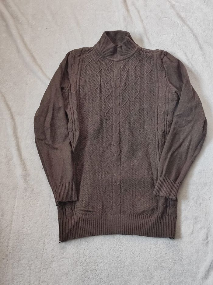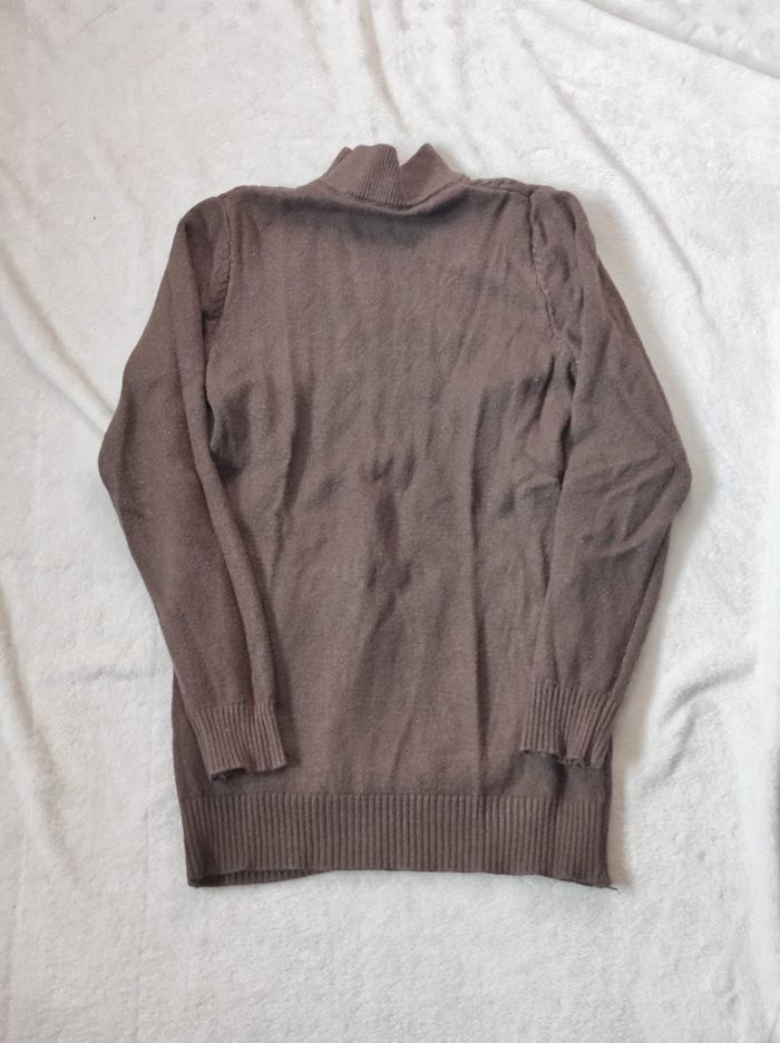 petit pull long à petit col montant de couleur vert kaki , extensible et doux au toucher. Porter deux fois mais peut avoir quelques petites bouloches, défauts. 55% viscose, 30% fibre polyester et 15% nylon. Ni trous tâches ou déchirures. Taille unique. Dimensions Épaules 32 cm Aisselles 40 cm Taille 37,5 cm Hauteur 64,5 cm