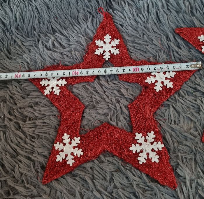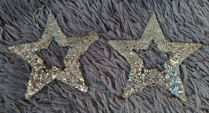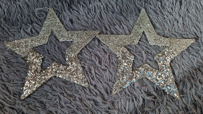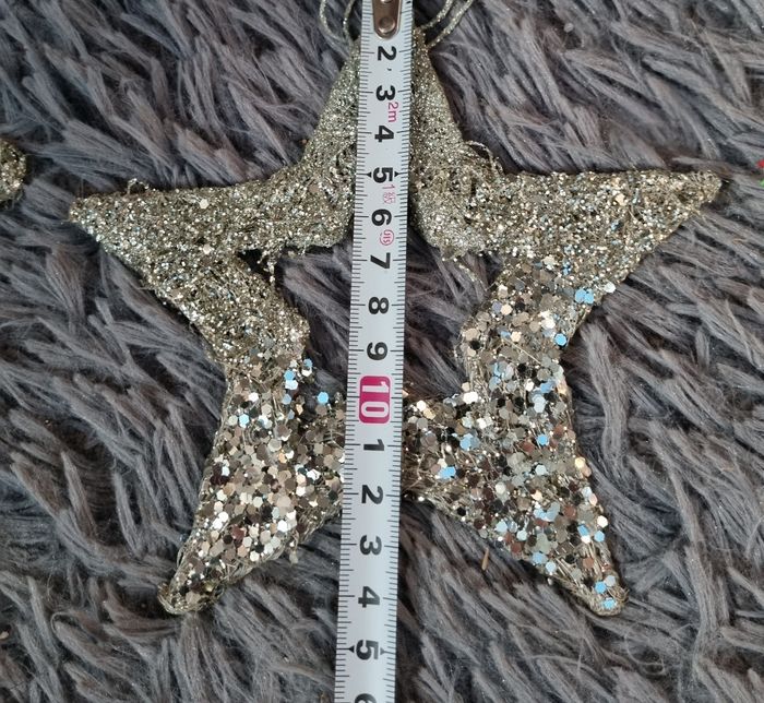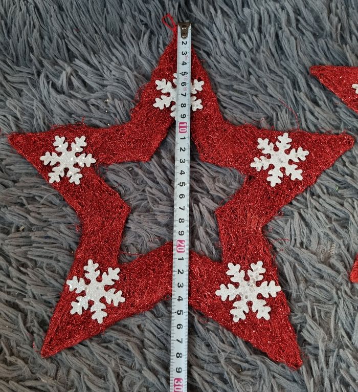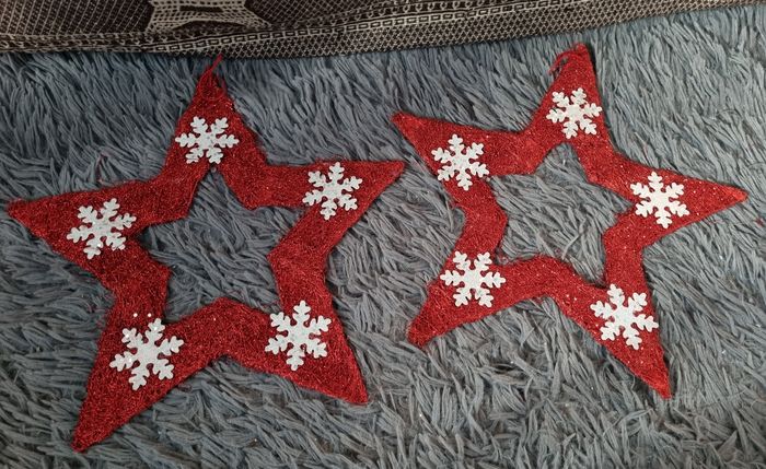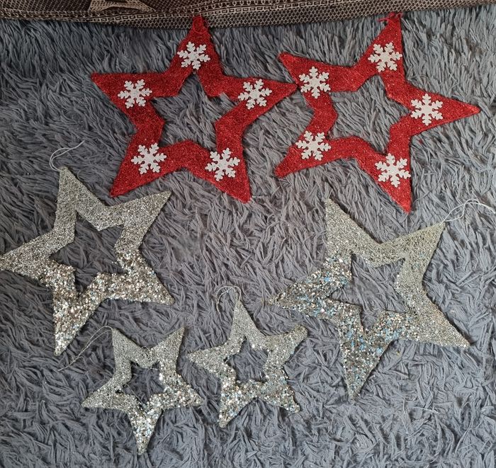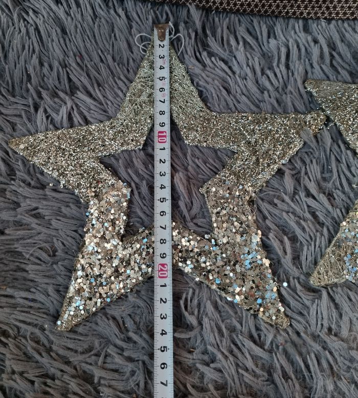 Lot décorations étoiles de Noël, dimensions en photos, manque des paillettes à certains endroits mais sinon très jolie.