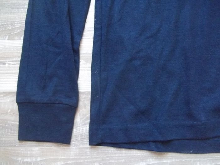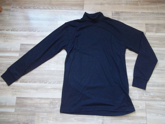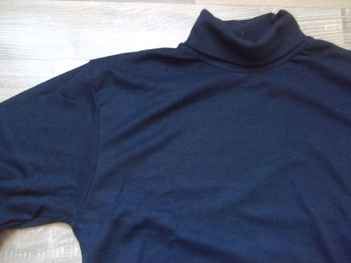 Pull à manches longues et col haut doublé (env 12 cm), jersey fin 100 % acrylique, bleu marine, poignets doublés (sur 7 cm). Longueur 75 cm, manches 62 cm, largeur épaules 45 cm, aisselles 49 cm. Le même en vert bouteille également dans mon dressing. J-L