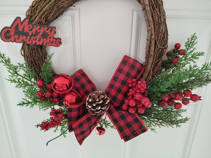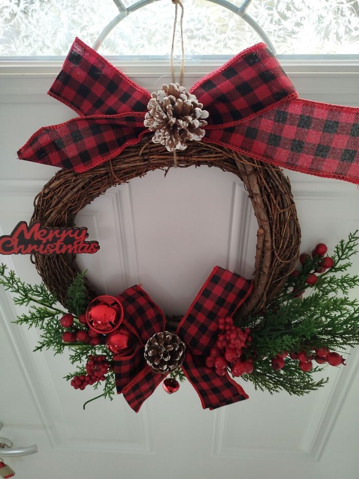 Magnifique couronne de Noël. En bois avec des gros noeuds rouge à carreaux en tissu, des pommes de pind et de jolies branches de houx et gui. Diamètre 32cm. Neuve avec étiquette.