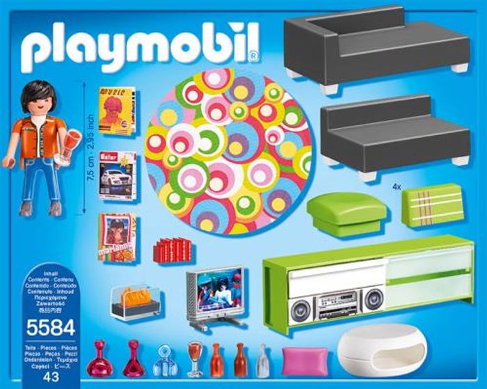 Playmobil 5584 city life Salon moderne Salon moderne avec un personnage, un canapé, une commode, une table basse et de nombreux accessoires (livres, télévision, bouteilles, magazines, tapis, coussins, …). Il y a tout pour passer d'agréables moments dans le salon moderne : un canapé d'angle confortable et une grande télévision ! Salon moderne avec un personnage, un canapé, une commode, une table basse et de nombreux accessoires (livres, télévision, bouteilles, magazines, tapis, coussins, …). Produit neuf dans son emballage d'origine non ouvert. NE CONVIENT PAS AUX ENFANTS DE MOINS DE 4 ANS !!