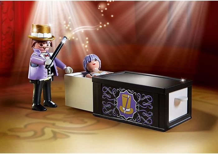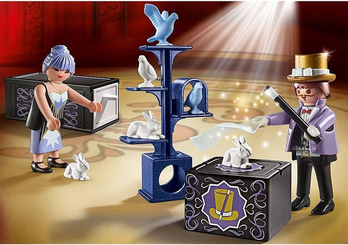 Playmobil family fun 70969 Le Magicien et sa Partenaire Contient 16 pièces Les habiles magiciens avec leurs boîtes à magie et leurs nombreux accessoires pour un spectacle palpitant. Les magiciens offrent des moments magiques aux spectateurs. Ils font vibrer le public avec leurs tours. C'est tout simplement fantastique quand les deux magiciens font disparaître et réapparaître des objets. Tout le monde aimerait savoir comment ils font, mais les secrets sont bien gardés. Le set de jeu comprend deux personnages ainsi que de nombreux animaux et accessoires pour réaliser les tours de magie. Produit neuf dans son emballage d'origine non ouvert. NE CONVIENT PAS AUX ENFANTS DE MOINS DE 5 ANS ! PETITES PIECES RISQUE D'ETOUFFEMENT !