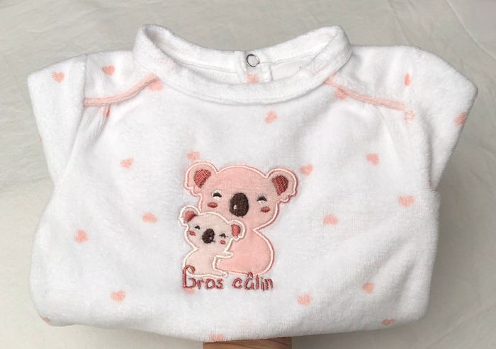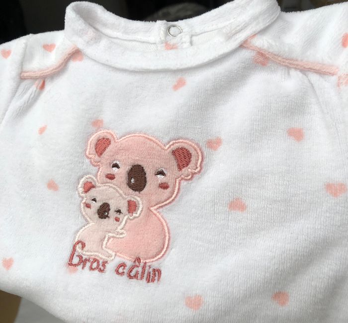Magnifique pyjama en velours blanc avec des petits cœurs rose pâle, motif maman et bébé koala, message brodé « Gros câlin ».