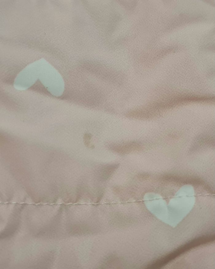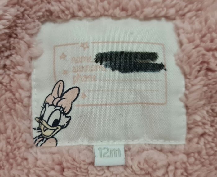 Anorak fille fourré à capuche 12 mois. Rose avec motif fleurs. Petite tâche devant à droite mais qui reste discrète (cf. photo)