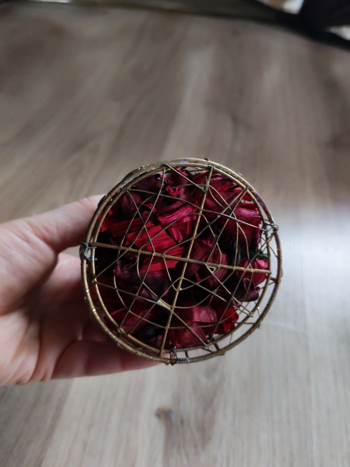 Décoration de Noel sapin pot pourri, en très bon état général. Décoration en métal argenté, remplie de fleurs séhées de couleur rouge. Dimensions : Hauteur : 19 cm Diamètre : 9 cm Poids : 84g