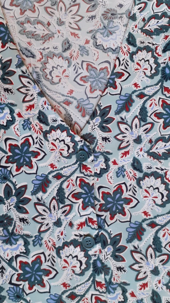 Vends une robe chemisier ou tunique longue, coupe droite, manches 3/4 avec élastique, fendue sur les côtés, col en V, en polyester, non doublée, couleur vert pâle avec motifs blanc, prune et vert foncé, marque Gémo, taille 56. Longueur de l'épaule à la base : 98 cm Largeur aisselle à aisselle : 73 cm Largeur au niveau des hanches : 71 cm.