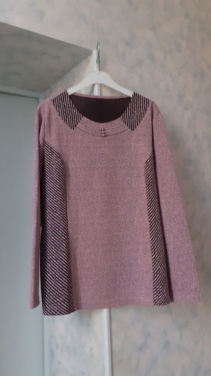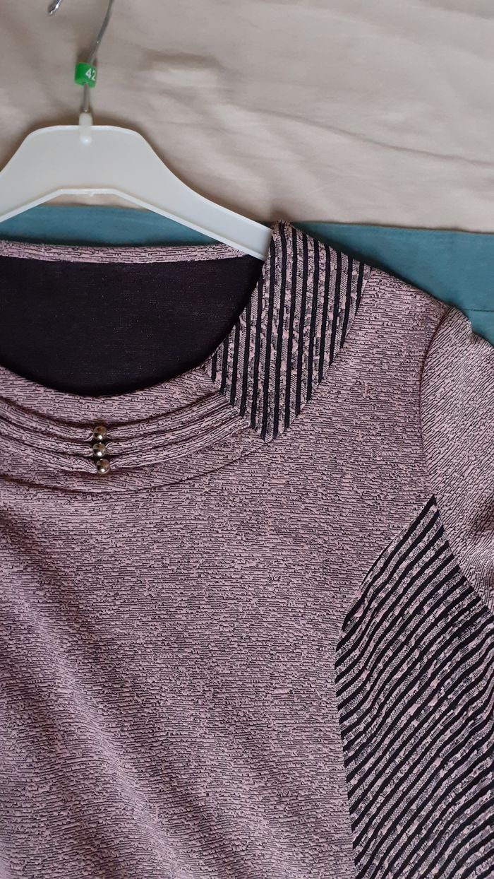 Vends un tee-shirt manches longues, 95 % polyester, 5 % élasthanne, tissu un peu épais, coupe droite, couleur vieux rose et rayures sur l'encolure et les côtés, taille 46-48. Longueur de l'épaule à la base : 66 cm Largeur aisselle à aisselle : 55 cm Largeur au niveau des hanches : 57 cm.