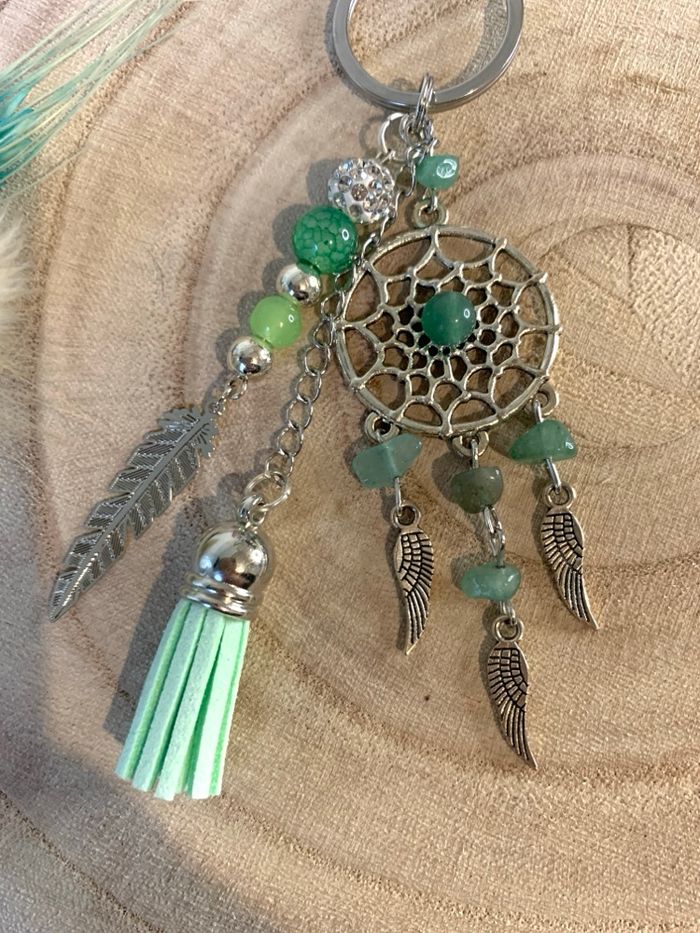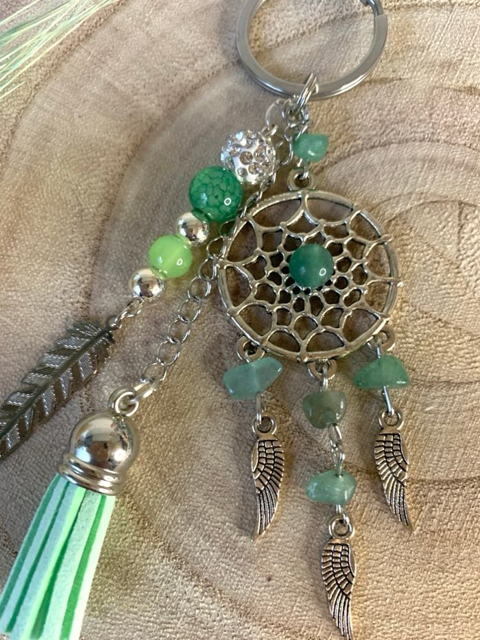 Original et unique bijou de sac « attrape rêves ». Il est en pierre naturelle « aventurine » voir signification sur la dernière photo ! - composé de perles, plume, pompon. - Mousqueton pratique pour accrocher facilement - pochette cadeau sur demande - Taille : 16 cm - Neuf avec Etiquette 💎 Existe aussi en œil de tigre et turquoise #bijoudesac #aventurine #cadeauoriginal #attrapereves #ideecadeau ✔️ Payez moins cher en faisant un lot !