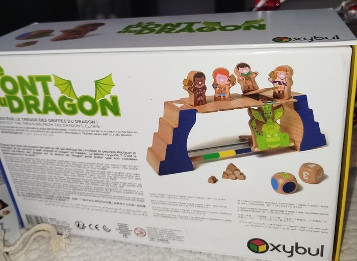 🎄Le pont du Dragon 🐉 Très joli jeu tout en Bois Jeu 🐉 à considérer Neuf, a été joué 1 fois Le pont du 🐉 est un jeu coopératif dans lequel les joueurs doivent faire traverser leur trésor de l’autre côté sans que le dragon 🐉 ne fasse tomber leur chevalier pour récupérer leur pépite. Chacun leur tour, les joueurs lancent un dé qui indique de combien ils peuvent déplacer le chevalier et un second à quel endroit le dragon 🐉 va frapper. La bonne nouvelle? C’est le joueur lui-même qui appuie sur la queue du dragon 🐉 pour éviter que son chevalier dégringolade hors du pont..
