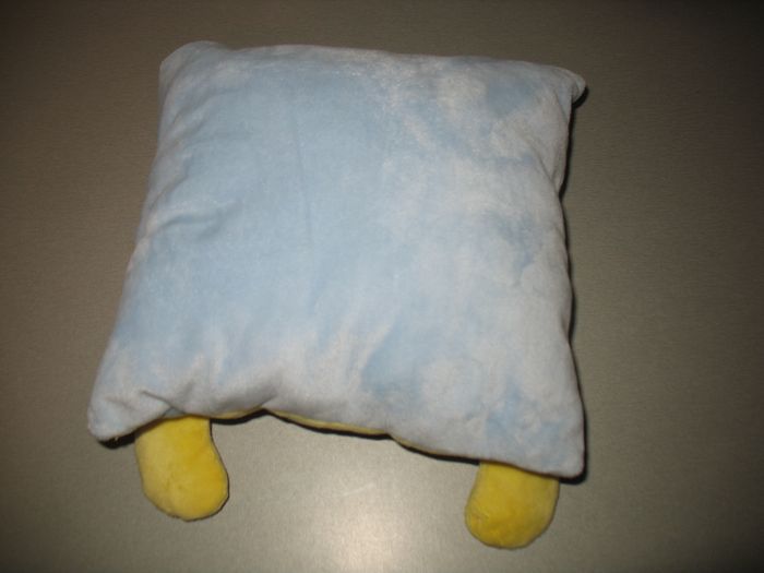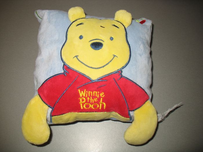 Petit coussin en peluche carré bleu avec motif Winnie L'Ourson - Oreilles et pattes en relief - Dimension : 22 x 22 cm.