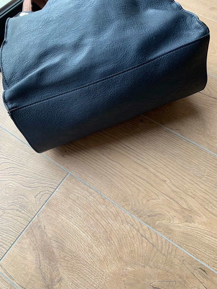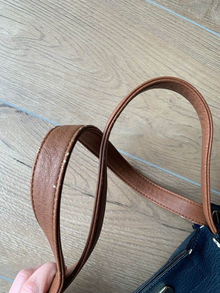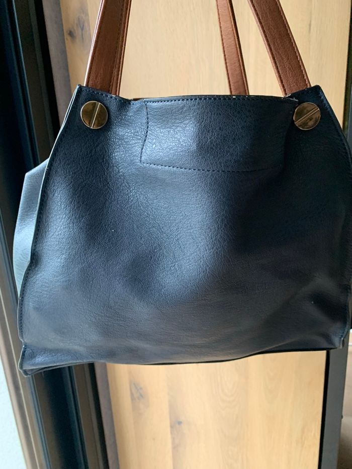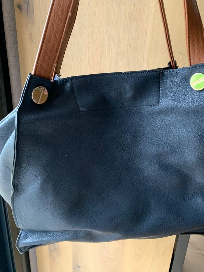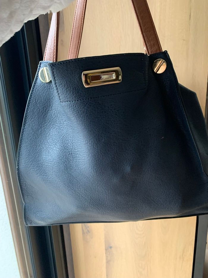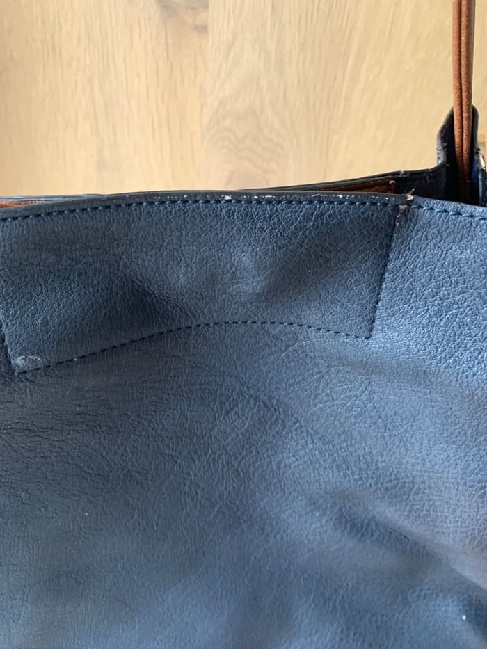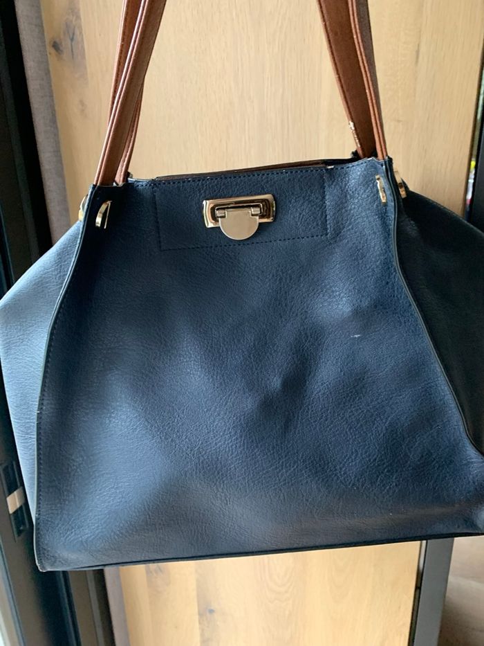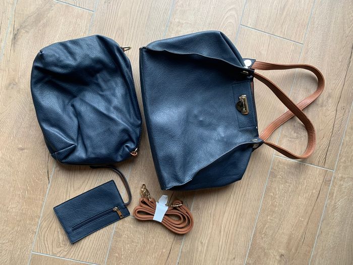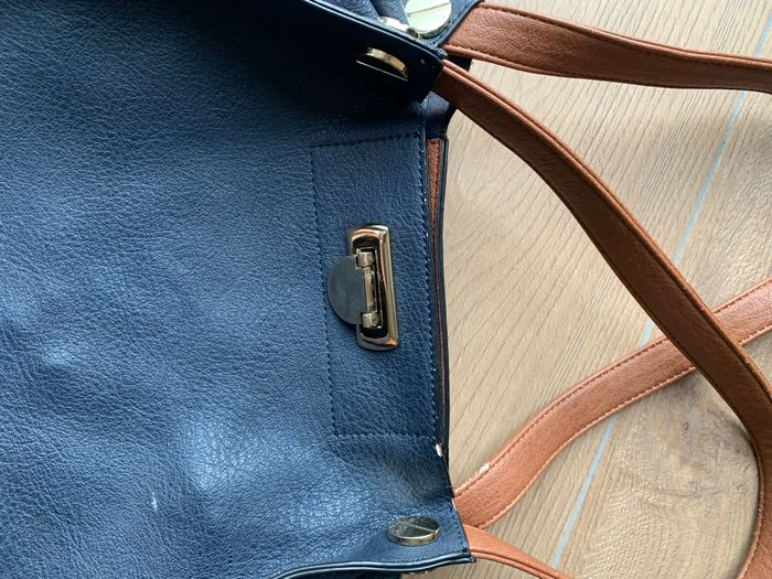 Grand sac à main bleu marine et marron 34 cm x30 cm avec pochette .Présente quelques signes d’usure visibles sur les photos
