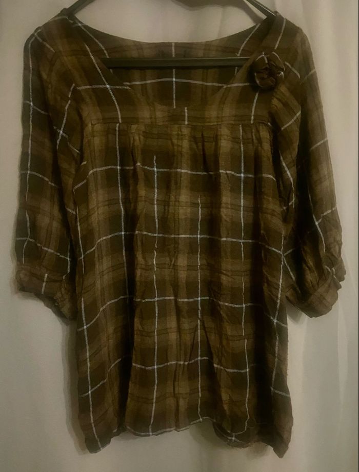 Haut à carreaux marron et bleu turquoise manches 3/4
