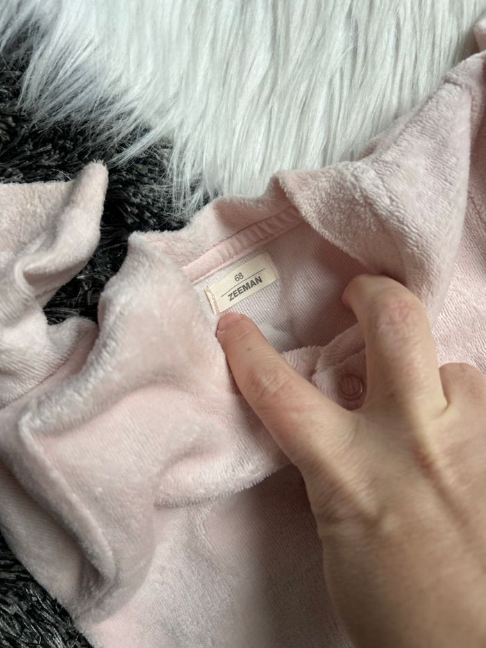 Pyjama Velours Zeeman 6M (68 cm) 🎀 Une adorable grenouillère / dors-bien en velours (pilou pilou) de couleur rose poudré doux. Parfaite pour le confort de bébé lors des nuits fraîches ! Caractéristiques Clés : • Marque : Zeeman • Taille : 68 cm (correspond à 6 mois) • Matière : Velours / Tissu très doux et moelleux. • Couleur : Rose poudré uni (très facile à assortir). • Pratique : Ouverture pressionnée tout le long sur le devant pour un change facile. • Style : Fermé aux pieds. État : Très bon état général. Un basique cocooning indispensable.
