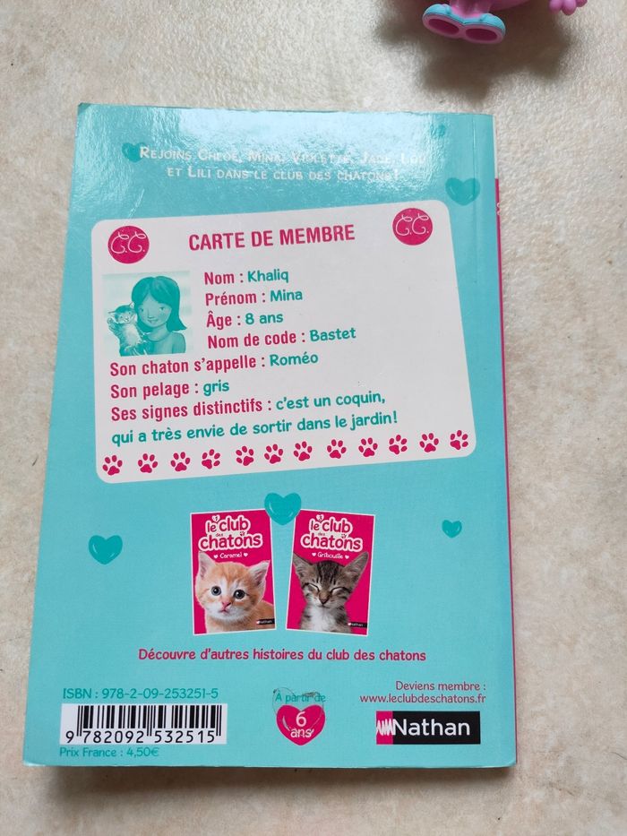 Rejoins Chloé, Mina, Violette, Jade, Lou et Lili dans le Club des Chatons ! Mina adore son chaton Roméo, mais ses parents craignent qu’elle n’ait pas assez de temps pour s’en occuper. Malgré ses efforts, un matin, elle oublie de lui donner à manger… et à son retour de l’école, Roméo a disparu ! 🔸 Âge : À partir de 6 ans 🔸 Nombre de pages : 92 🔸 Éditeur : Nathan 🔸 Tome : 2 🔸 Détail : Défaut au niveau de la couverture (visible en photo) Parfait pour les jeunes lecteurs fans d’animaux et d’aventures du quotidien. #didinedoralecturejeunesse #nathan #leclubdeschatons